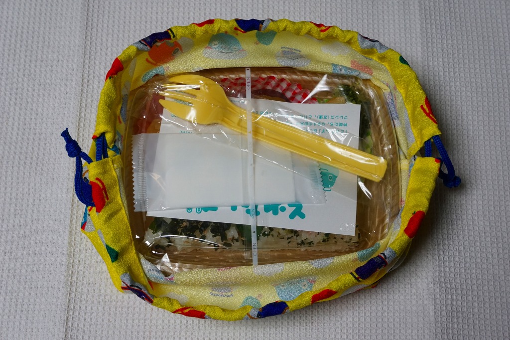 バスケット型の発泡材トレーに収まる中身は、わかめふりかけ、赤かぶ青菜ふりかけ、ツナマヨ茶飯で3個のミニ三角おにぎりと、鶏唐揚、ポテトフライ、サツマイモ、ポテトサラダ、ブロッコリー、カニカマの玉子巻き、りんご煮を少しずつ詰めたお子様ランチ。2018(平成30)年限りで終売か。