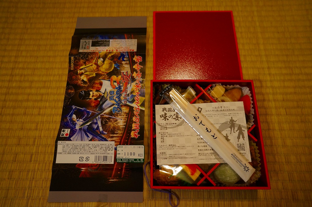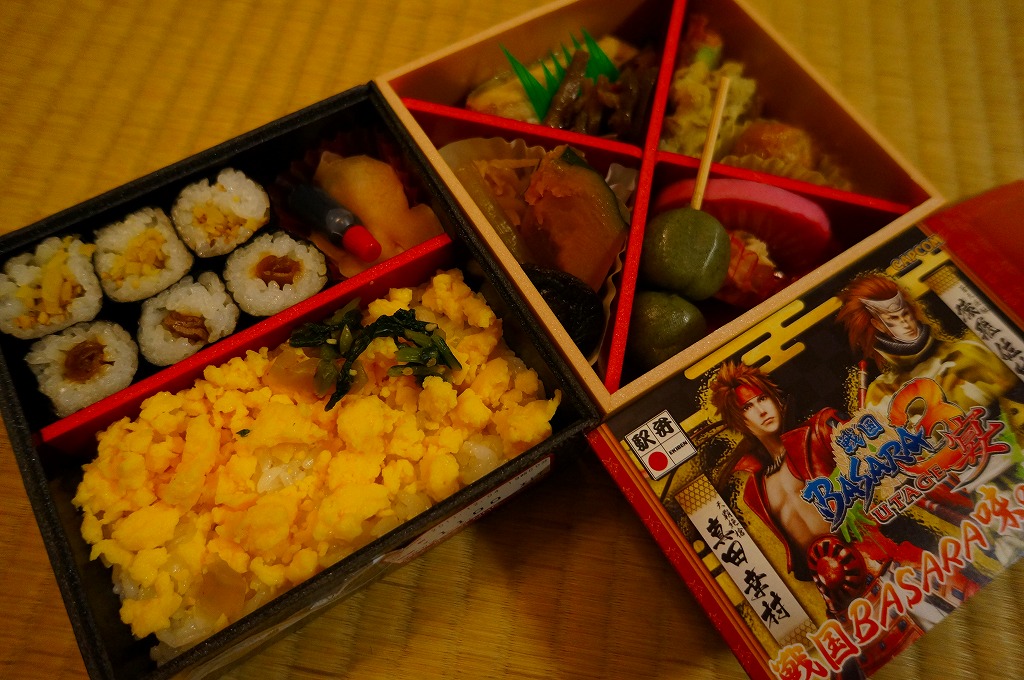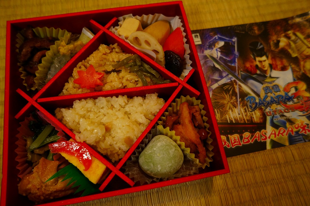 真っ黒な長方形の容器に、そのゲームソフトにおける上杉謙信と前田慶次の姿を印刷した掛紙を巻く。中身はちらし寿司、白飯と茶飯の俵飯、有頭海老、ホタテ風味フライ、ししとう、おみ漬、笹団子、玉こんにゃく、サトイモやニンジンなどの煮物、切昆布煮など。上杉謙信の新潟県と前田慶次の山形県をイメージしたのだそうな。こちらはゲームにも戦国史にもうといので、食べ合わせとしては脈絡がないとか、朝食にはちょっと重いかなという感想。