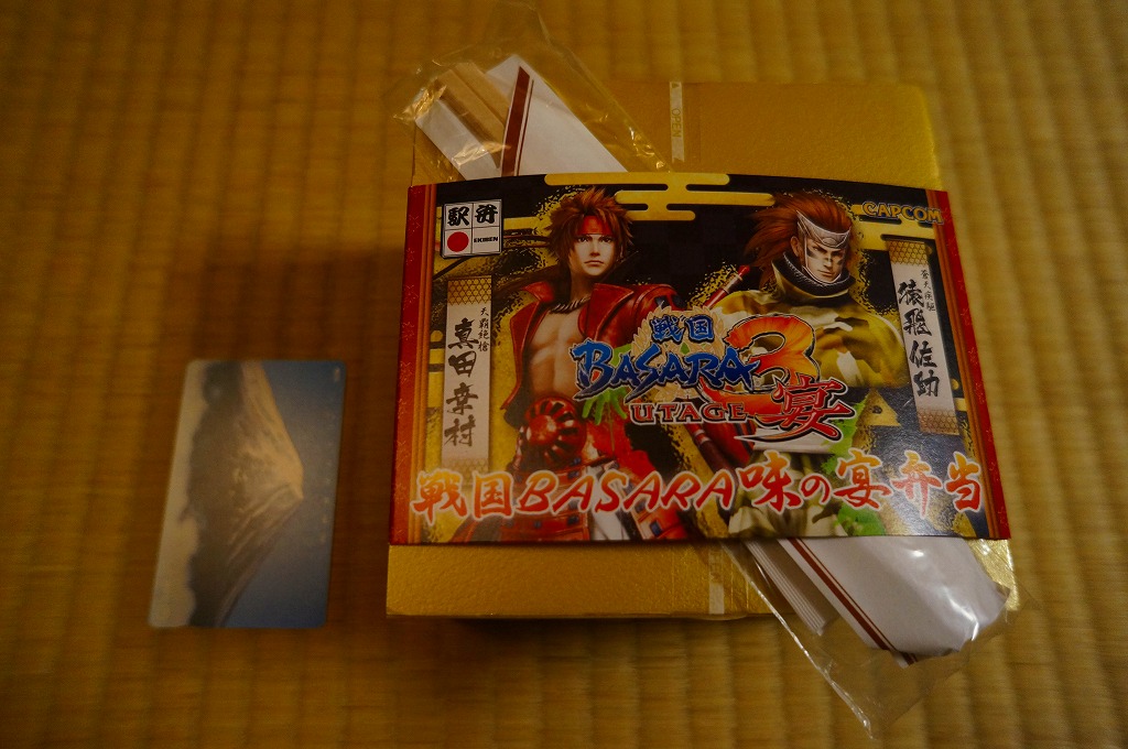 今回の駅弁大会では、前月発売の戦国BASARA弁当が早くも復刻販売、しかも週替わりの3種類すべてが雁首を揃えるという、3週続けて買ったコレクターを嘲笑う仕打ちをしてくれていた。