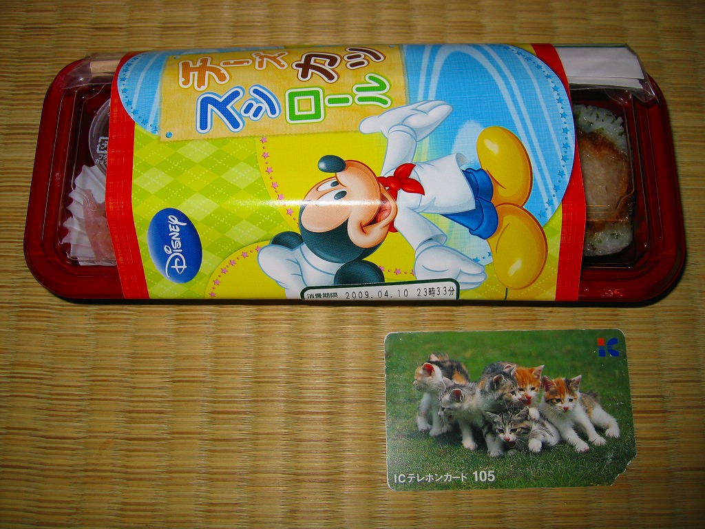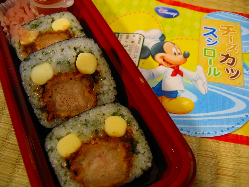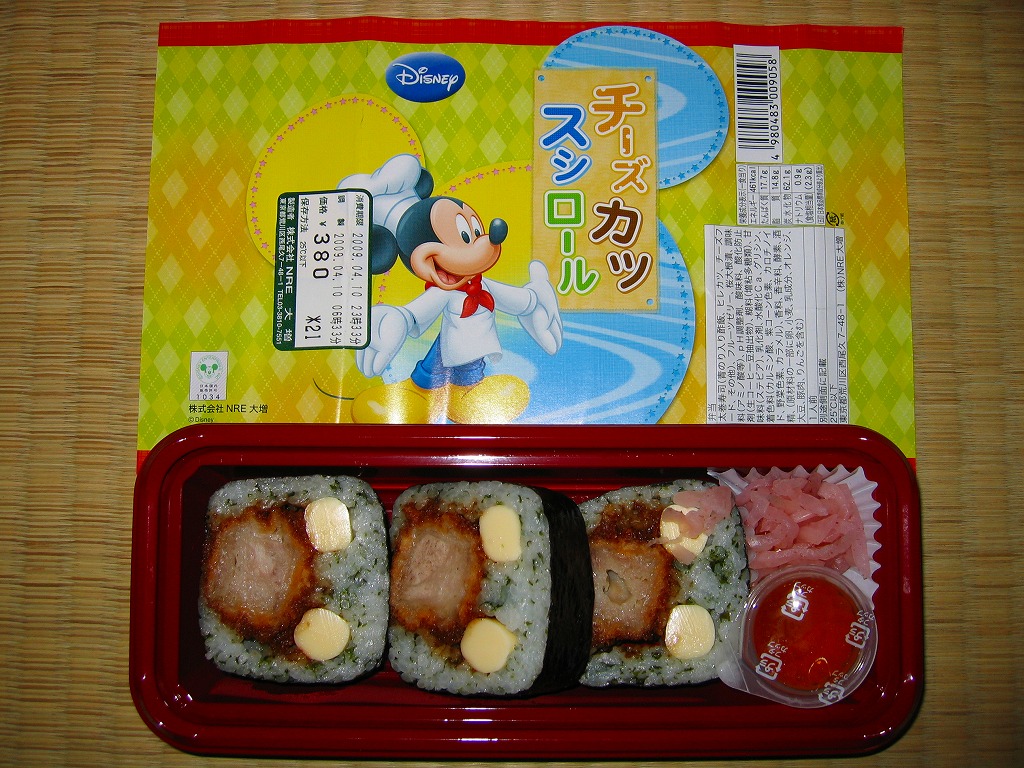 2009(平成21)年4月に発売か。平たく言えば3切れしか入っていない太巻寿司であるが、酢飯に青のりを混入し、カツ1本にチーズ2本を巻くことで掛紙に描かれるキャラクターを模し、カップ入りゼリーと紅生姜を添えてプラ製の惣菜容器に詰めて、掛紙で巻いているもの。見た目も味もとっても楽しい感じ。該当のテーマパークへの乗換駅で売られることで、駅弁への注目をより集める役回りを演じてくれる。年内に終売か。