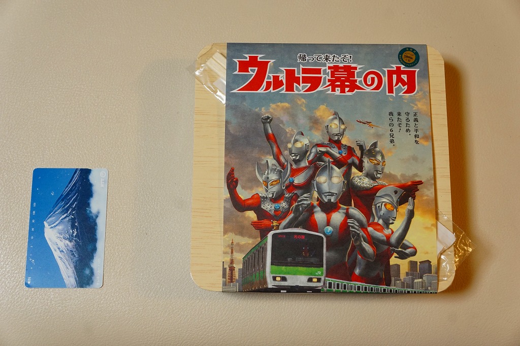 そんな中身は、古風なタイプの幕の内駅弁で、かつて東京駅で「駅弁の日記念弁当」などの名で売られた記念駅弁と、だいたい同じ。掛紙と、3種類のうちひとつがついてくる添付のめんこに、怪獣絵師の開田裕治が描いた、ウルトラマンシリーズのイラストが使われた。