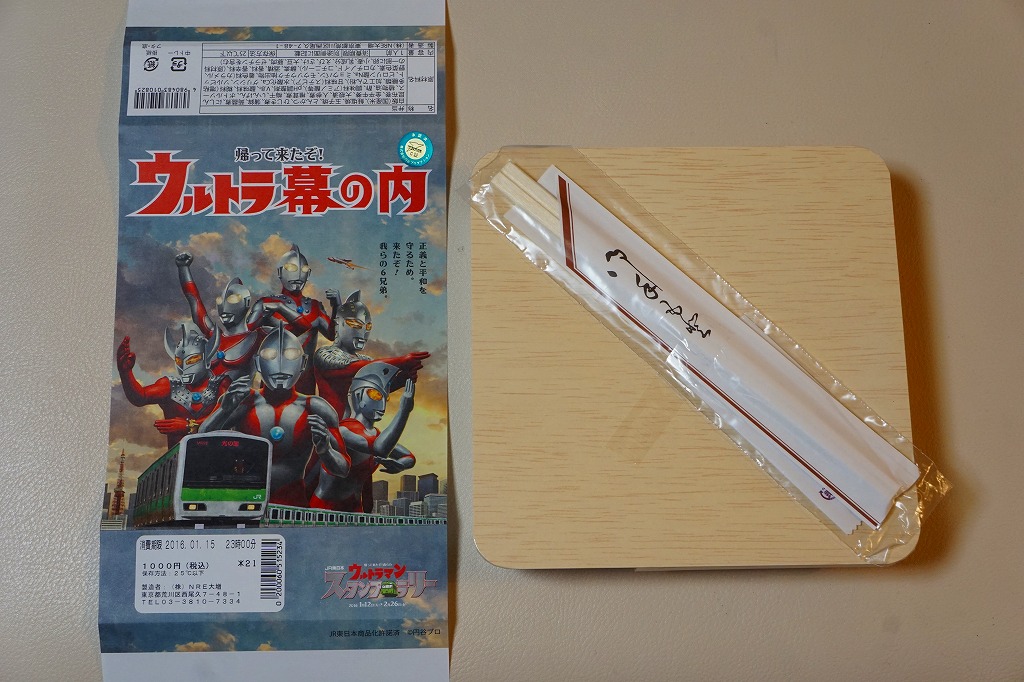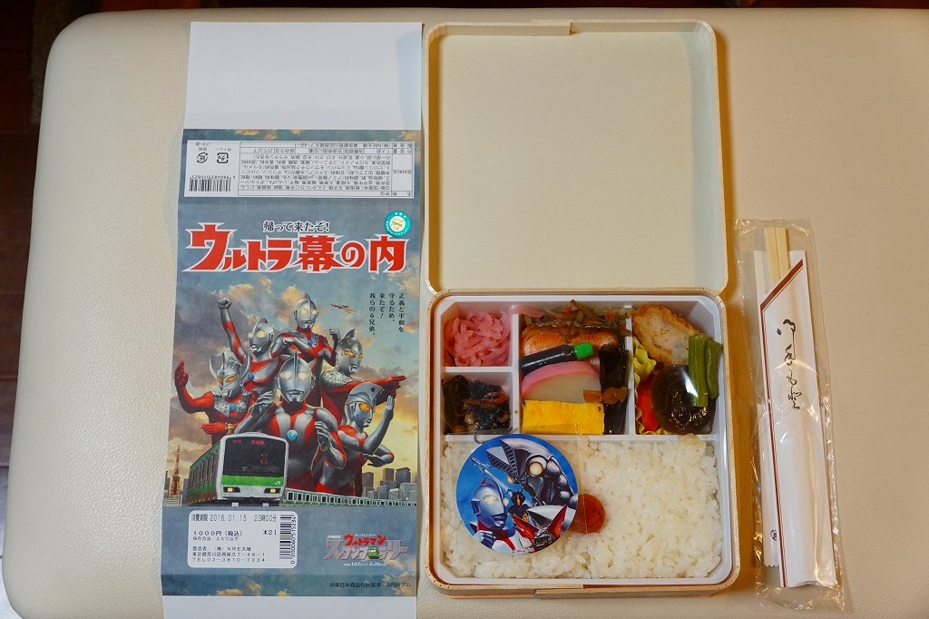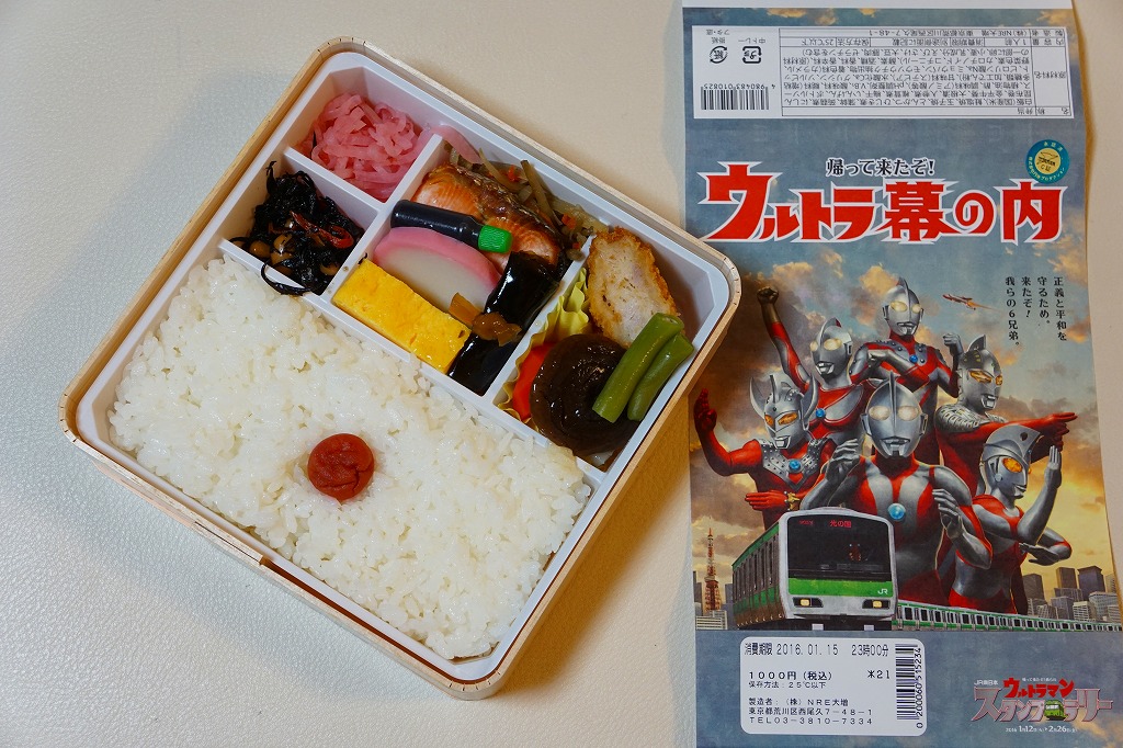 JR東日本のイベント「ウルトラマンスタンプラリー」の実施に合わせて、その実施期間である2016(平成28)年1月12日から2月26日までに、東京、新宿、品川、上野の各駅で1.5万個を販売。中身は日の丸御飯に焼鮭、かまぼこ、玉子焼と、昆布巻、シイタケやインゲンなどの煮物、とんかつ、ひじき煮、きんぴらごぼう、大根桜漬など。