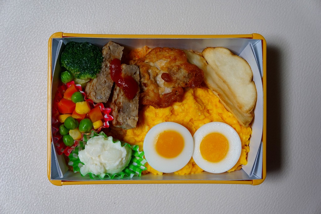 中身はケチャップライスにハンバーグ、鶏唐揚、ポテトフライ、卵とじ、ゆで卵スライス風、ブロッコリー、ポテトサラダ、ミックスベジタブルを載せたもの。これもキャラクター仕様か、見た目の半分をタマゴが占め、そのために食べた感じはガッチリ冷凍食品というものでもなし。2018年までの販売か。