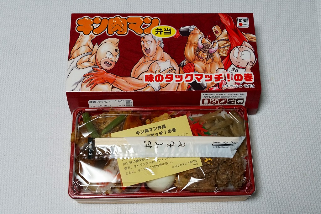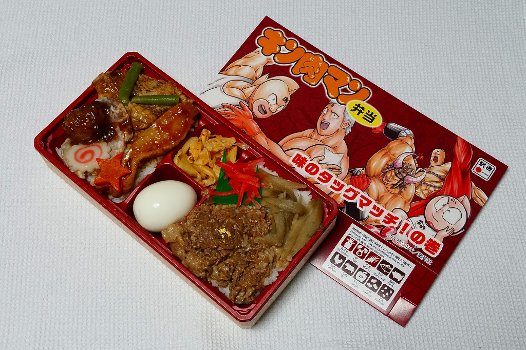 中身は牛丼と肉丼とゆで卵と付合せ。キン肉マンを金粉を載せた牛ごぼう煮、バッファローマンを網焼きカルビ、テリーマンを鶏照焼(とりてりやき)、ミートくんをミートボールで表現。加えてラーメンマンをチャーシューやナルト、作者のゆでたまごをゆで卵で表現したようだ。黄色いしおりに中身の理由を書いて分かりやすいイベント商品で、そうでなくても強力な肉駅弁。次の巻は出るのだろうか。