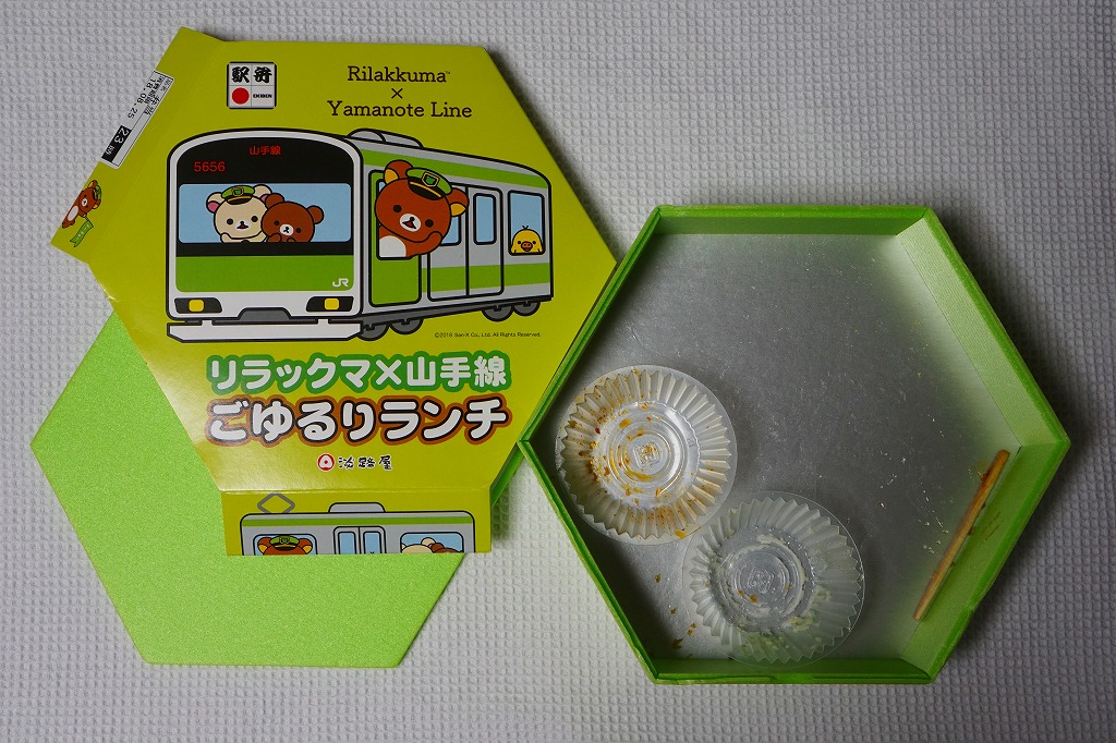 正八角形の容器と、駅弁の名前のとおりリラックマと山手線を描くスリーブは、JR山手線の色であるウグイス色(黄緑色)をしている。中身はマーガリン飯、目玉焼き、とんかつ、ペンネ、鶏つくね、ブロッコリー、エビフライ、ポテトサラダなどのお子様ランチ。山手線の環状運転にちなみ、丸い食べ物を多用したそうな。2020年1月までの販売。