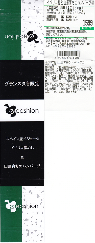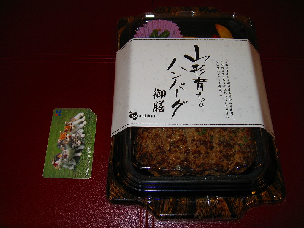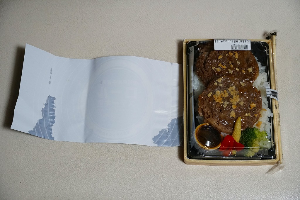 2007(平成19)年10月25日の東京駅地下1階商業施設「グランスタ」のオープンと同時に発売か。鉄板焼プレート風のプラ製トレーに透明な上げぶたをして、商品名を書いた掛紙を巻く。中身は白御飯、ハンバーグ、ポテト、ニンジン、インゲンという、ガチなファミレス風ハンバーグステーキ。山形県産の牛肉と黒豚を使ったそうで、ハンバーグのジューシーさは駅弁にないもの。一方でデパ地下弁当らしくて駅弁らしくないとも言える。