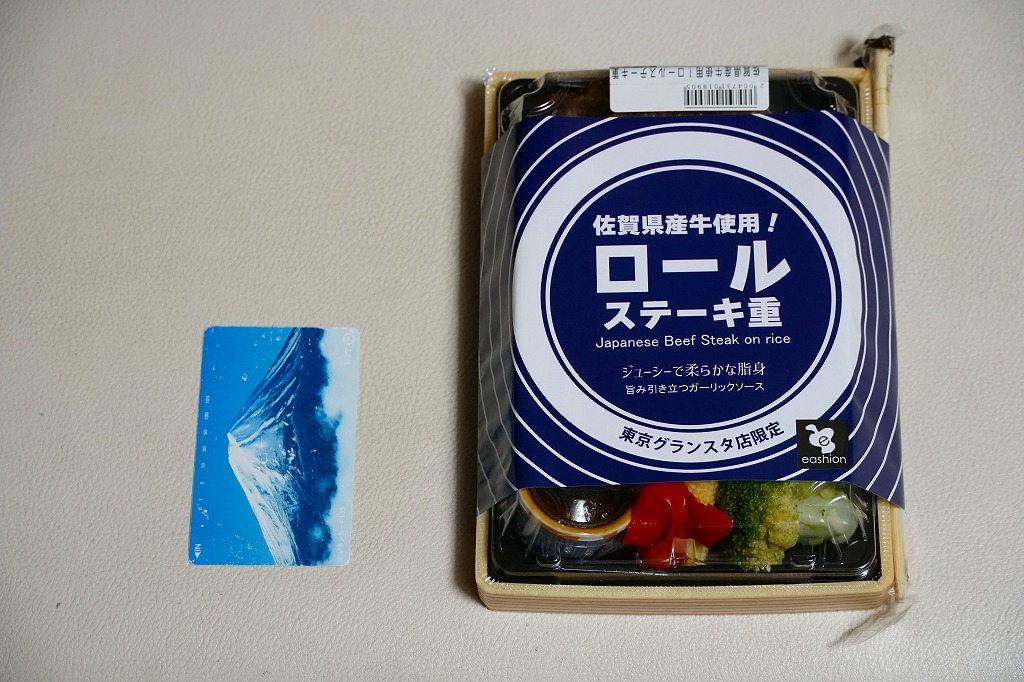 中身の見栄えを確保しながら上げ底の工夫で内容量を削減しコストを抑えられることを売りとする商材である、今時の惣菜弁当向けプラ容器に、商品名と同心円を描く青い掛紙を巻く。この容器に白飯を薄く塗り、薄くスライスした佐賀県産牛をミルフィーユのように1枚1枚ロール状に巻いて焼き上げたロールステーキを2枚貼り、フライドガーリックを振り、ヤングコーン、ブロッコリー、パプリカ、ガーリックソースなる醤油だれのカップを添える。牛ステーキには思えないけれど、焼肉の味と香りがする平たいハンバーグが面白い、駅弁屋で売られる駅弁にない味。