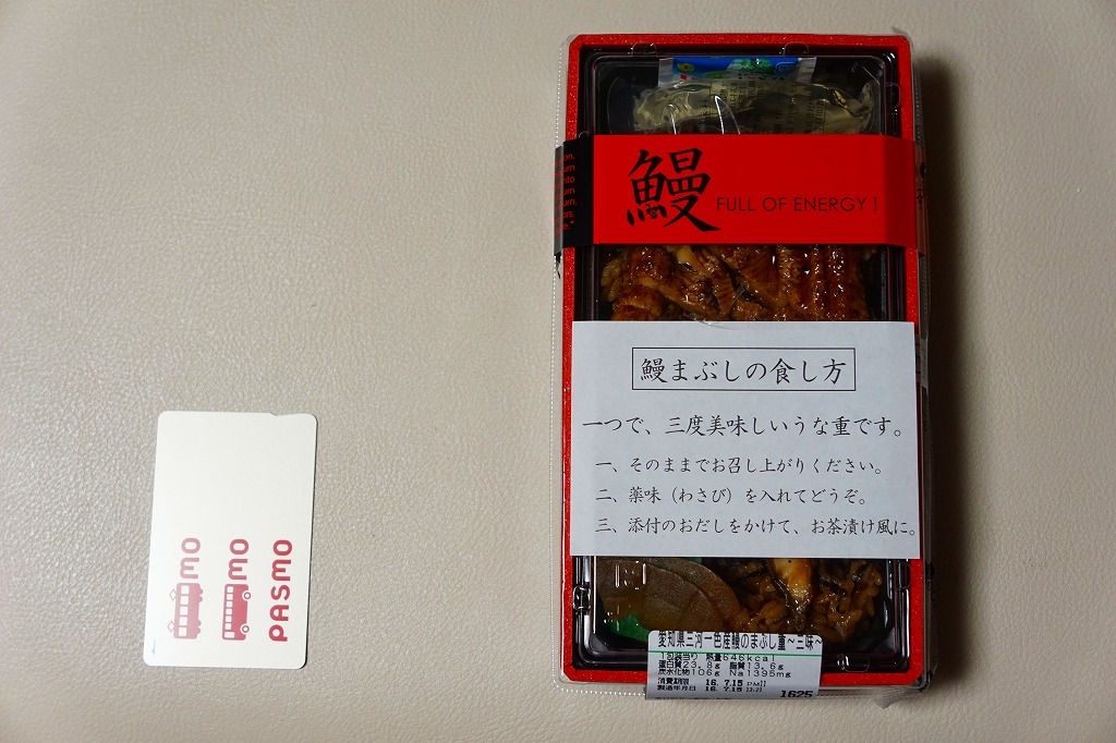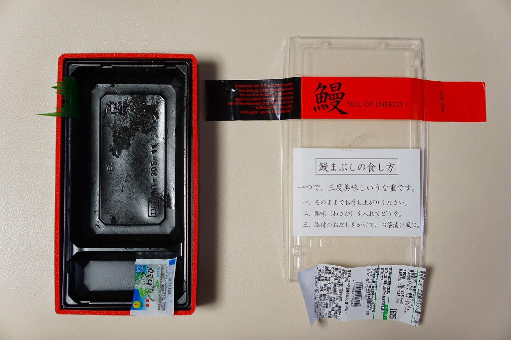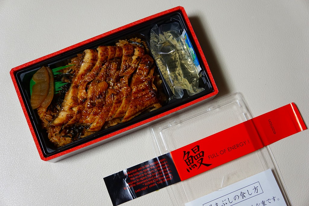 東京駅構内の商業施設「グランスタ」で買えたお弁当。2014年頃から土用の丑の日の頃にのみ販売か。紙帯には「鰻」としかないが、食品表示での商品名は「愛知県三河一色産鰻のまぶし重〜三味〜」。ここでイベリコ豚重が大当たりした、eashionの商品。タレでどす黒くなった御飯を、これまた濃い色のウナギ蒲焼きで覆う。ふたに貼り付けた「鰻まぶしの食し方」のとおり、名古屋名物のひつまぶしのような食べ方を推奨し、そのためのワサビの小袋と、だしの大袋を詰める。ヤワな容器と、分量もタレもたっぷりの飯とウナギを見ると、そのまま鰻丼として食べ切りたくなる。ウナギはまるで鶏照焼スライスのような形状で千切りにされ、実分量以上のボリューム感があった。