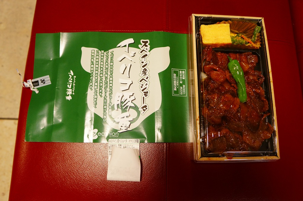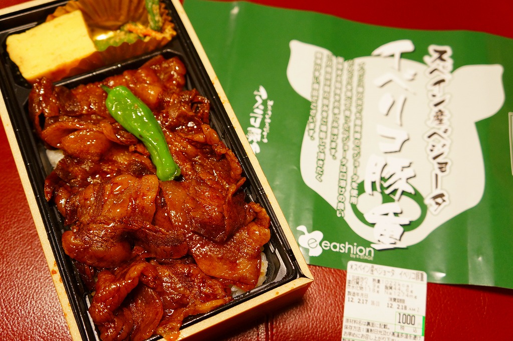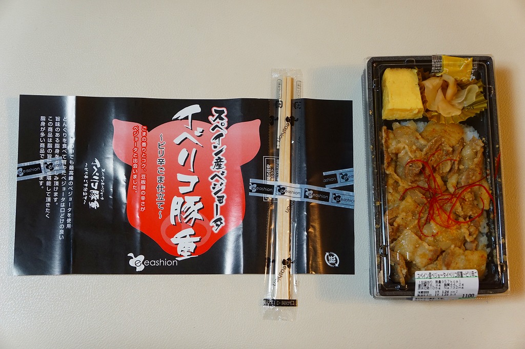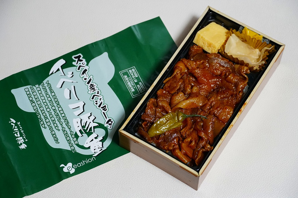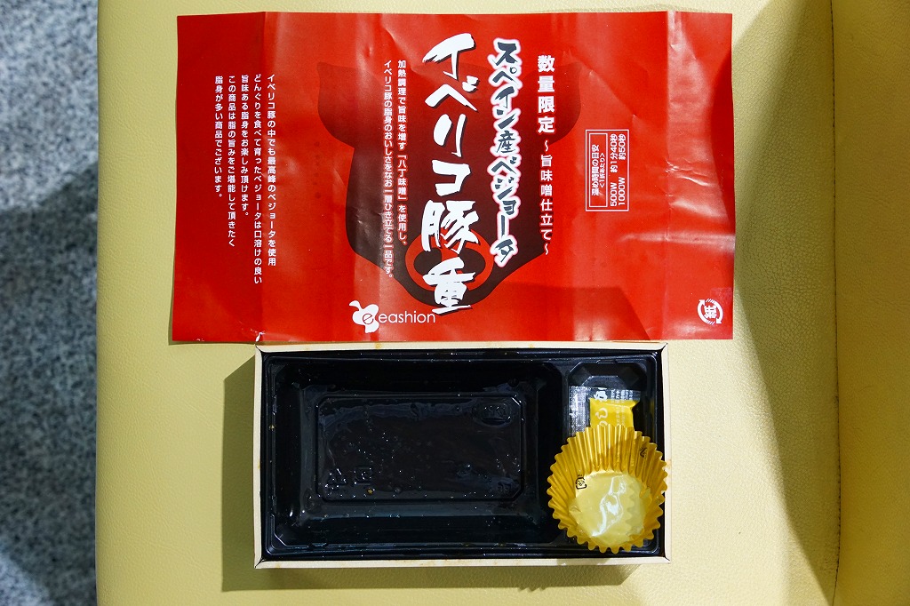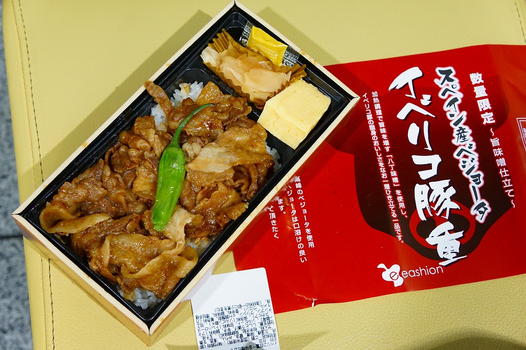 東京駅のデパ地下で一番人気の弁当「スペイン産ベジョータイベリコ豚重」の別バージョン。下記の通常版のタレ味の掛紙を、緑色から赤黒く変え、味付けを八丁味噌にした。商品名と、にゅるにゅるした豚肉の豚丼であることに、変わりはない。