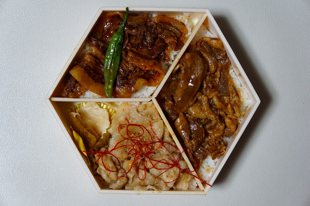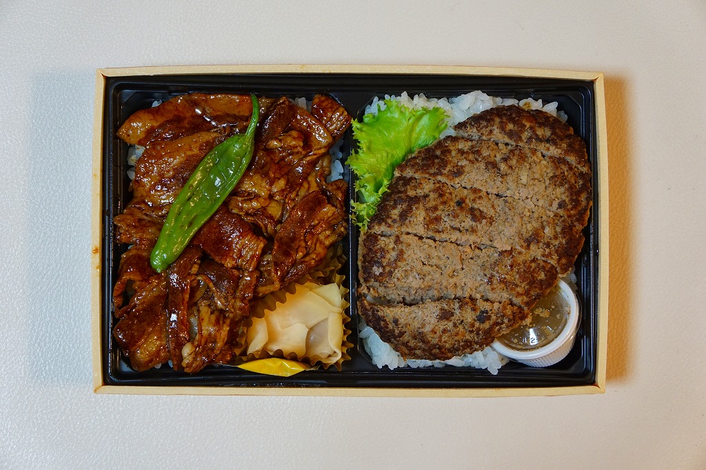 東京駅構内の商業施設「グランスタ」地階の食品売り場で販売されているお弁当。ふたつの区画を持つ容器の両側に白御飯を詰め、一方に味付豚肉を、もう一方に牛肉ハンバーグを載せる、豚丼とハンバーグ丼の組合せ弁当。ここの人気商品「スペイン産ベジョータイベリコ豚重」と同じ場所でともに販売。スペイン産ベジョータイベリコ豚重の部分は同じ味で、山形育ちのハンバーグも、控えめなビーフと焼きの香りに、ふわふわないしボソボソの固め方が、味と食べやすさで白御飯と車内食に合う感じ。
