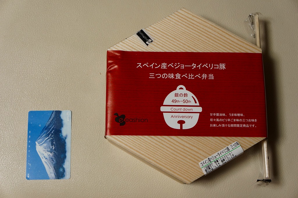 東京駅の待合せ場所シンボル「銀の鈴」の設置50年を理由に、2017(平成29)年6月1日から18日まで東京駅構内の商業施設「グランスタ」で展開されたキャンペーン「銀の鈴フェア」の期間中に販売されたお弁当。正六角形の容器に、商品名とフェアの鈴のマークを描いた掛紙を巻く。中身は豚丼が3等分で3種類。甘辛醤油煮、うま味噌味、坦々風のピリ辛ごま味で、ここでの人気駅弁「スペイン産ベジョータイベリコ豚重」が入る。ここのいつもの味で違う風味な、豚丼づくしのお弁当。
