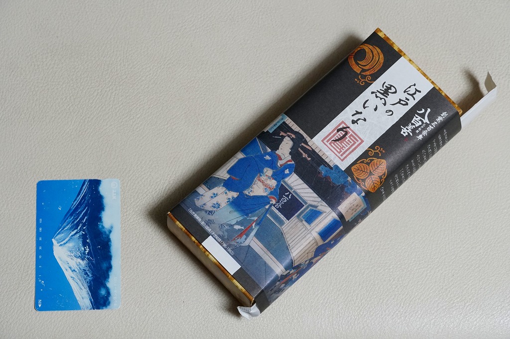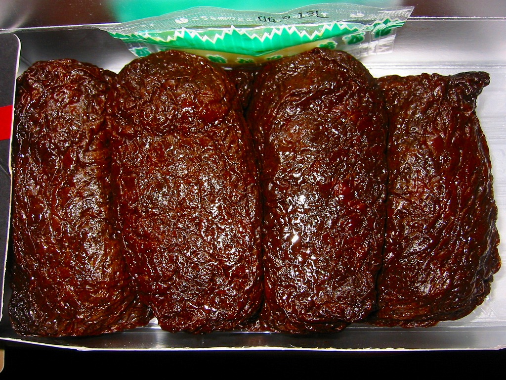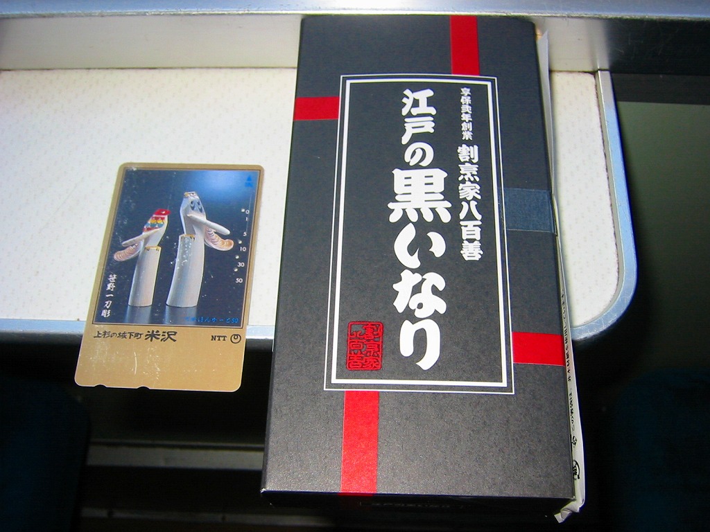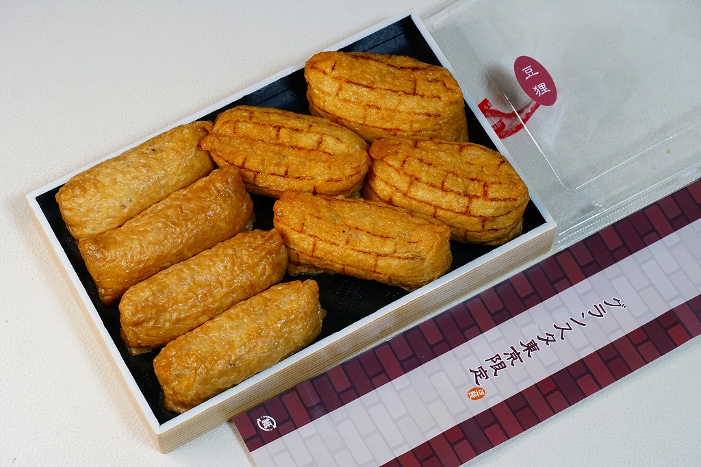 2004(平成16)年3月26日の発売。十代三百年続く都内の割烹屋「八百善(やおぜん)」が監修した、黒砂糖を使ったいなりずし。8センチ×16センチの小さな紙箱に黒糖色のおいなりさんが4個入り550円。味は黒かりんとうをなめたような黒糖の甘さが強く、万人受けするものではないかもしれない。同封のしおりによると、江戸で琉球王国産の貴重な砂糖を使い二月の初牛の稲荷明神開帳日に親戚知人に振る舞ったものだという。東日本キヨスクの弁当売店「膳まい」での取り扱い。数年間の販売か。