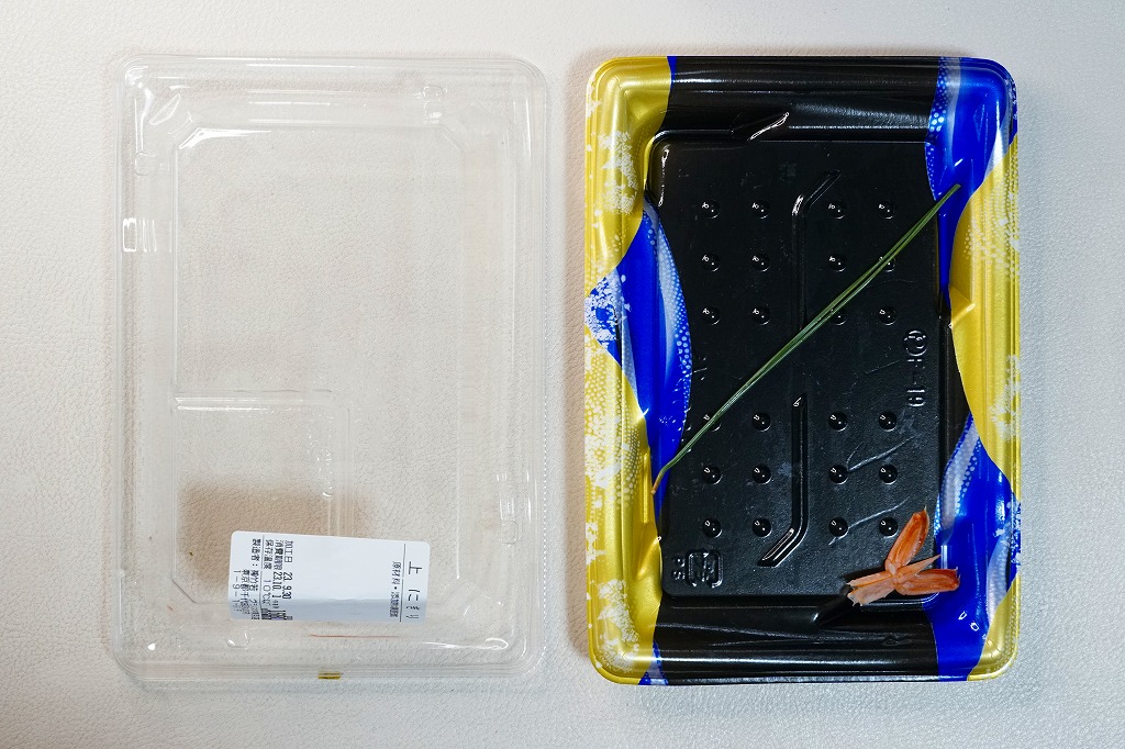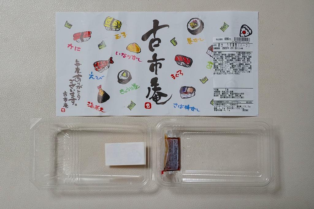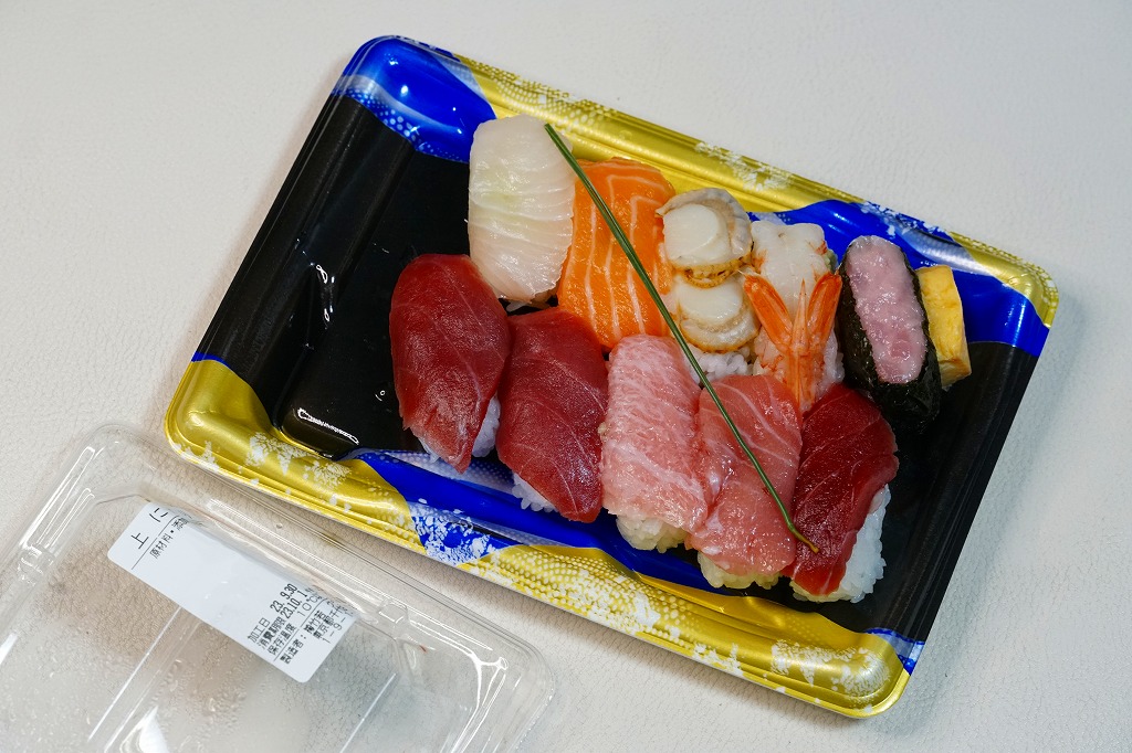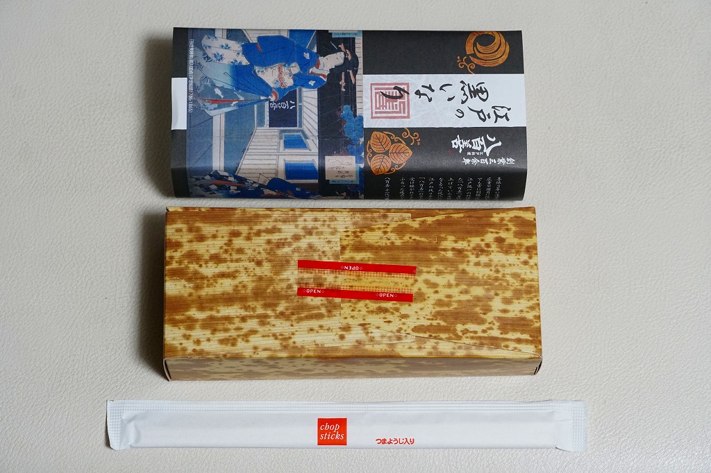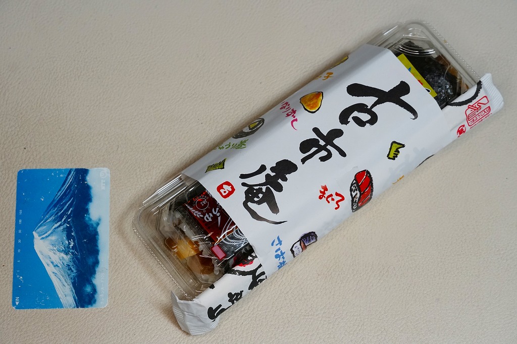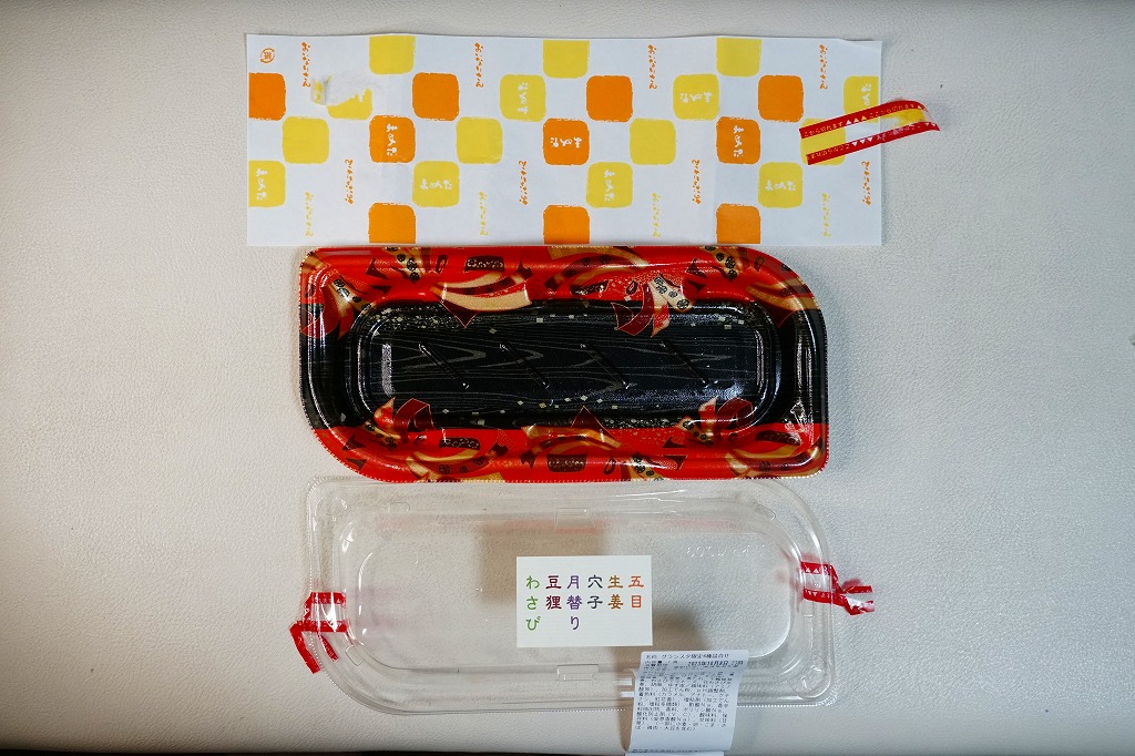 東京都心でチェーン展開する持ち帰り寿司店が、東京駅限定で販売する商品のようで、商業施設の出入口にそんな宣伝看板が出ていた。同店の品川駅限定商品と違い、見た目が駅弁らしくないものの、よく見ると商品名のシールに鉄道の地図記号や電車の顔がみえるから、駅売りを意識した商品だと思われる。筋子でなく魚の味と量で、値段に納得。価格は2023年の購入時で1,580円、2025年時点で1,680円。