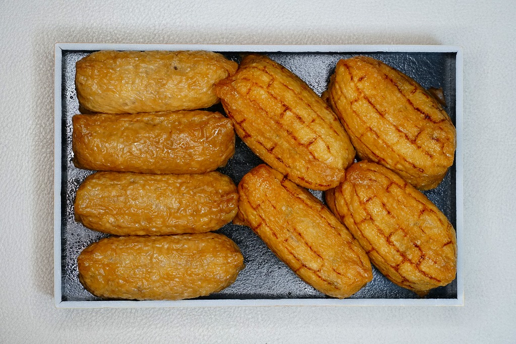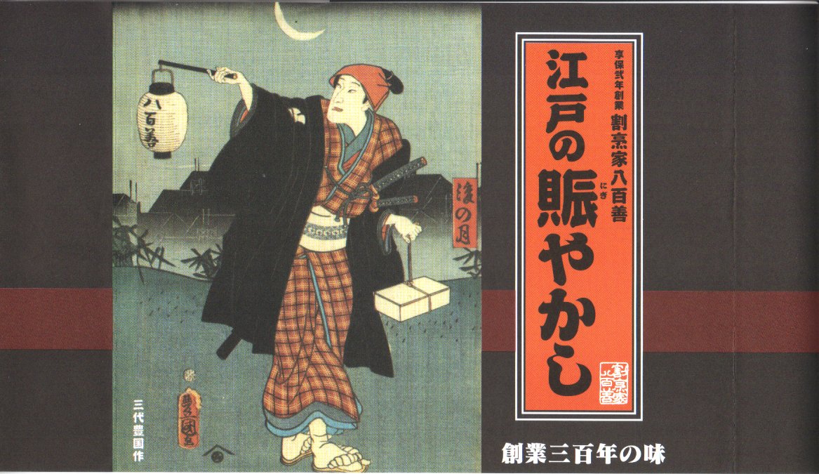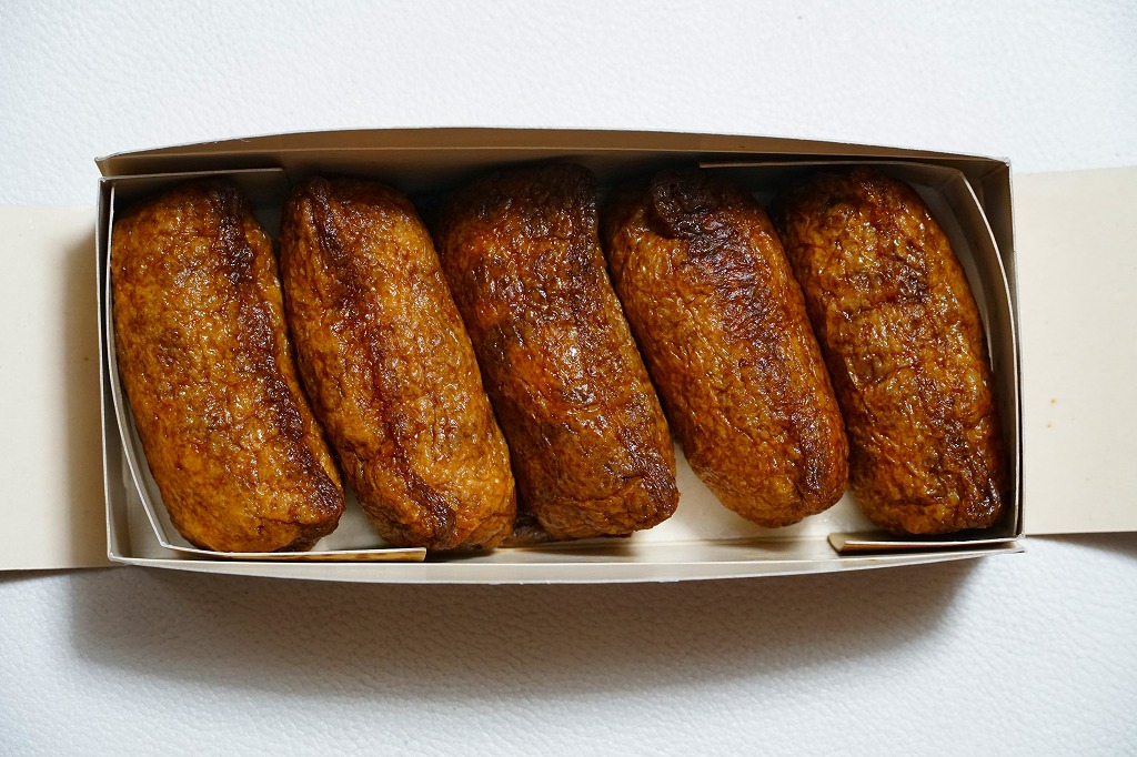 2022(令和4)年の春に東京駅などの駅弁売店「HANAGATAYA」で発売か。下記のとおり18年前にも同じ名前と中身の商品が発売されており、久々の再登板となった。黒い掛紙で創業三百余年江戸料理「八百善(やおぜん)」を名乗り、調製は水戸駅弁のしまだフーズとなっている。中身は黒い稲荷寿司が5個。生姜酢漬と白ごまを混ぜた酢飯を、黒糖で炊いたらしい油揚げに詰める。それ以外は何も入れない、袋詰めの甘酢生姜や紅生姜や醤油のようなものも入らない、シンプルすぎる商品。味の癖はなくなり、甘辛の辛はないが甘すぎることもない、食べやすいおいなりさん。