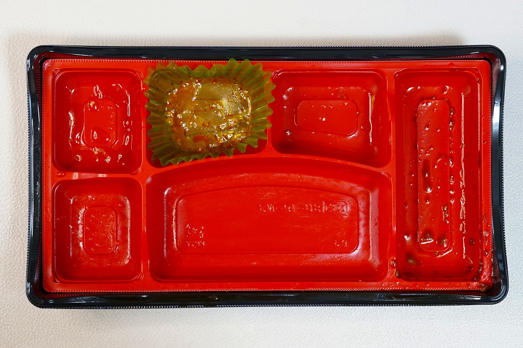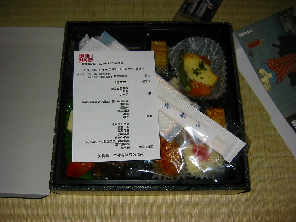 経験的に駅弁屋の調製ではない東京駅弁は、運搬中にビニール袋の中で転倒する確率が高い。これもその被害に遭い、気が付いたら容器が横に立っていて、大粒いくらが煮物や容器の隙間に飛散した。こういう気遣いに駅弁屋とそれ以外との差が出る。中身の見た目は悲惨だが、風味は散らし弁当になって乙なものだった。おかずもていねいに作られていた。現存しない模様。