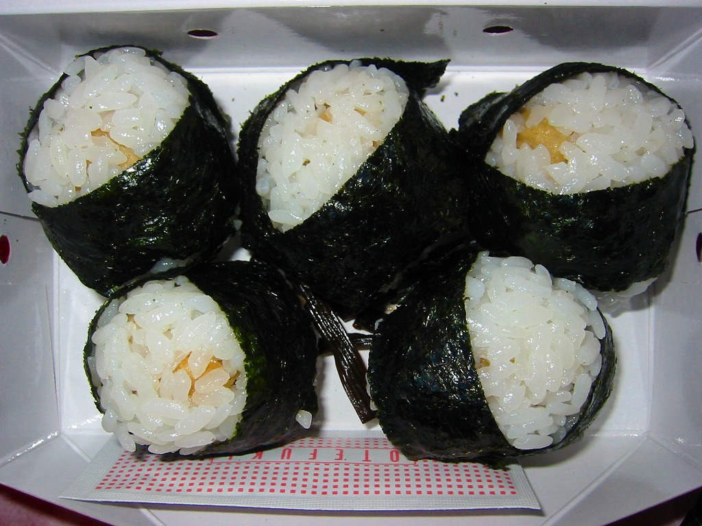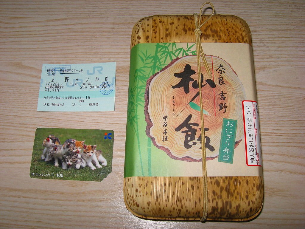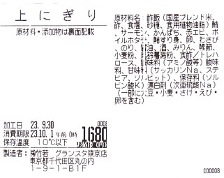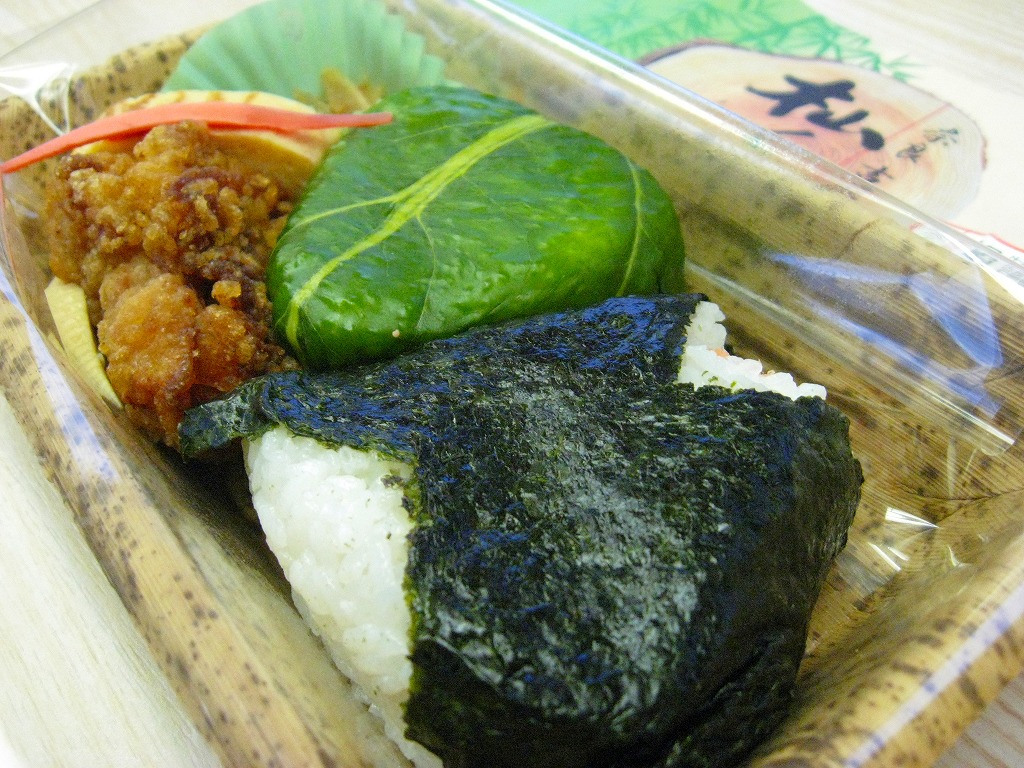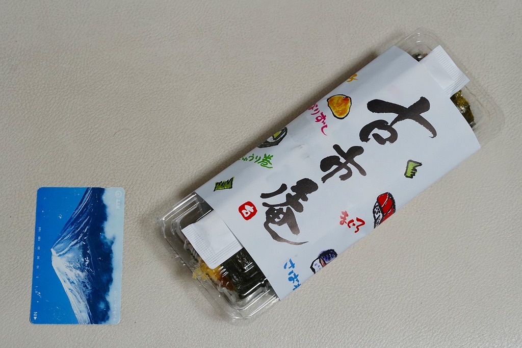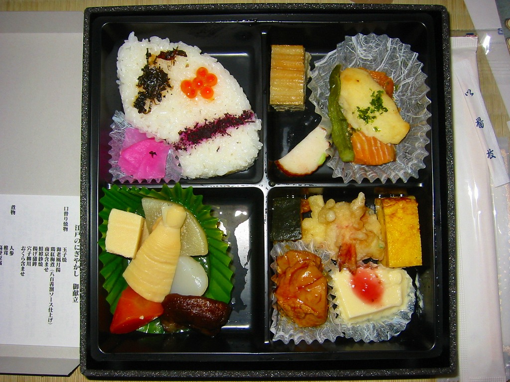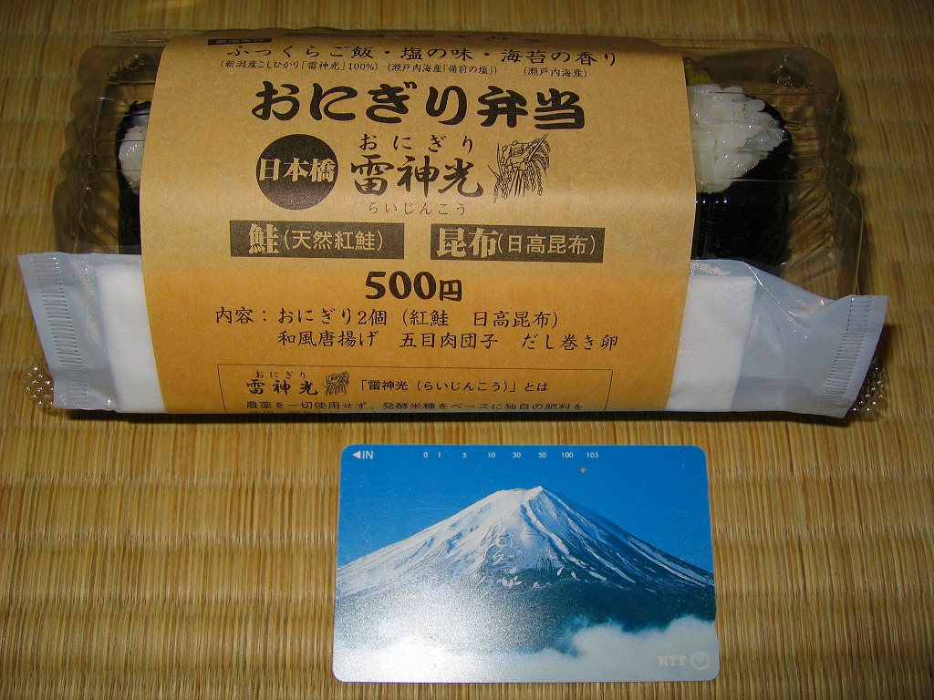 東京駅構内のJR系コンビニで買った商品。透明なプラ製容器の中に、鮭おにぎりと昆布おにぎりが1個ずつと鶏唐揚、玉子焼、肉団子が入るコンビニ弁当だが、NREの駅弁売店で売っている太巻きと同じような体裁を備え、しかもブランドネームまで入れているので、駅弁と見なされたり紹介される可能性を感じる。味はコンビニの水準を超えている。このブランドの商品や店舗が消えた2007年頃までの販売か。