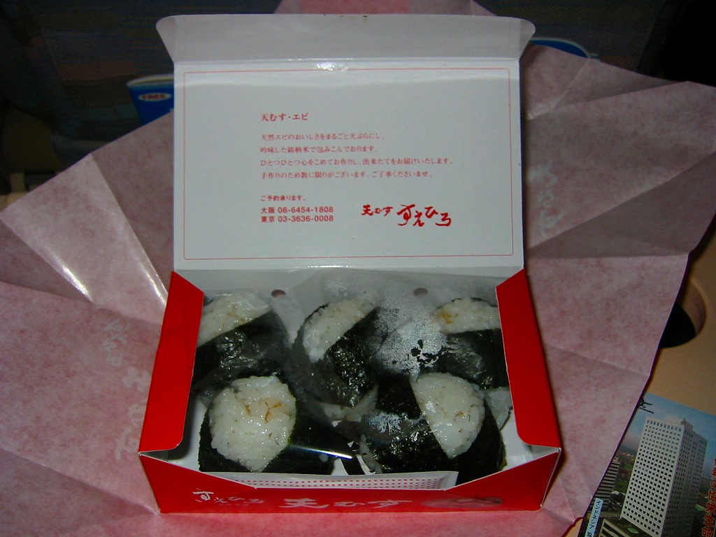 包装は土産物風で、小さなボール紙容器を包装紙で包装する。中身はひとくちサイズの天然海老天ぷらのおむすびが5個。味は良いがこの分量でこの価格はなかなか高価で、実は高級弁当。横浜のスーパーで購入したが販売箇所に東京駅構内が入っていたので、ここで紹介。