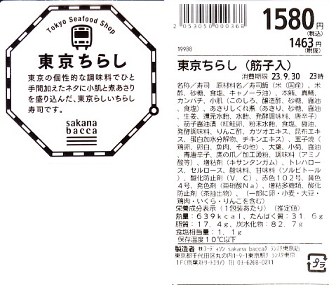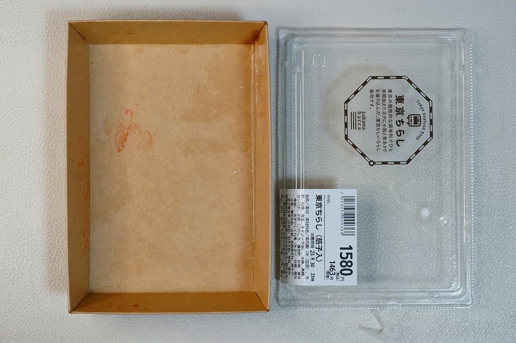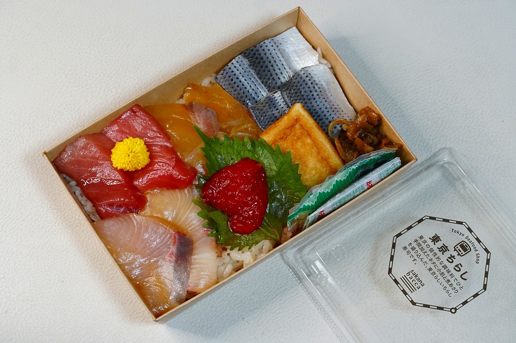 東京駅の駅構内商業施設「京葉ストリート」には2022年4月に入居したテナント「サカナバッカ」で買えた惣菜弁当。デパ地下で見られるような、ふたが透明の長方形容器に酢飯を詰め、マグロ、マダイ、カンパチ、コハダの切り身で覆い、あさりしぐれ煮、大葉に載せた筋子醤油漬、玉子焼を添える。刺身で酢飯を覆い尽くした、高級か豪華なちらしずし。
