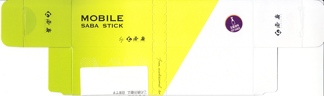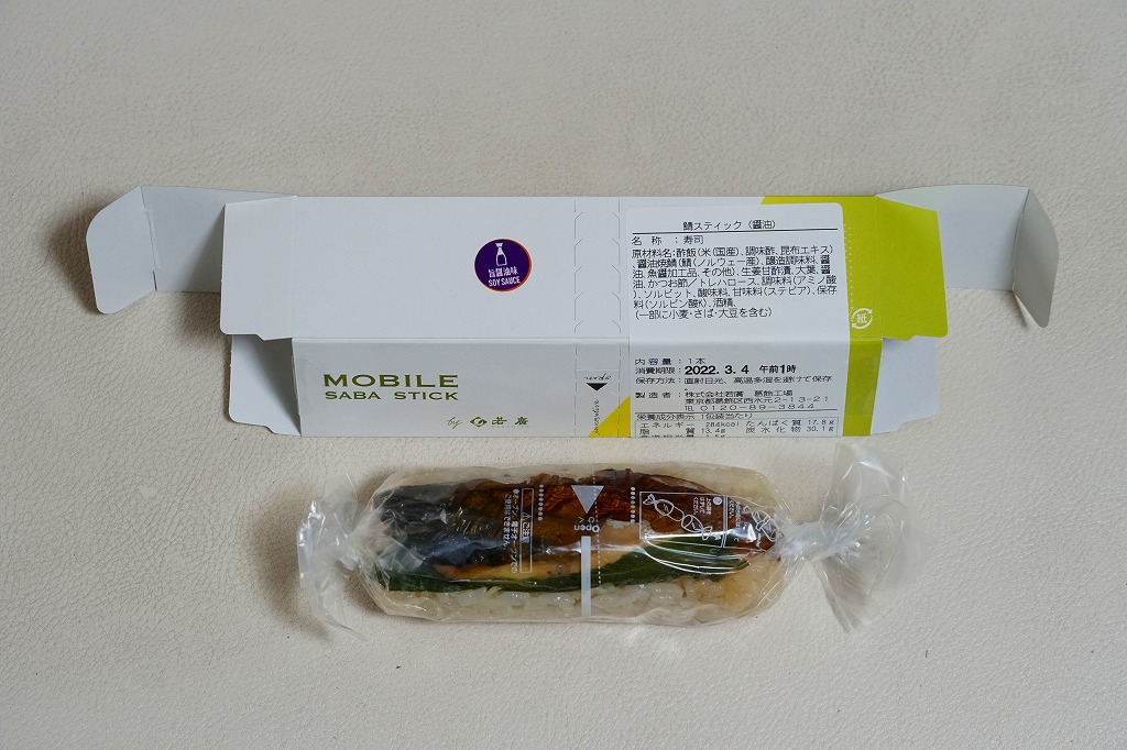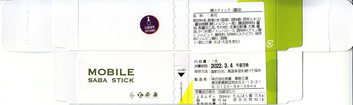2020(令和2)年3月に東京駅の商業施設「グランスタ」地下1階の食品売り場に店舗を設けた若廣(わかひろ)が、この店舗限定で販売し始めた商品。中身は同店で主力の焼きサバ寿司であり、酢飯に焼きサバを貼り付ける。そんな中身をおおよそ想像できない、細身で小さなボール紙箱には「MOBILE SABA STICK」とあり、食品表示ラベルの商品名は「鯖スティック(醤油)」、シールとレシートには「旨醤油味」とあった。