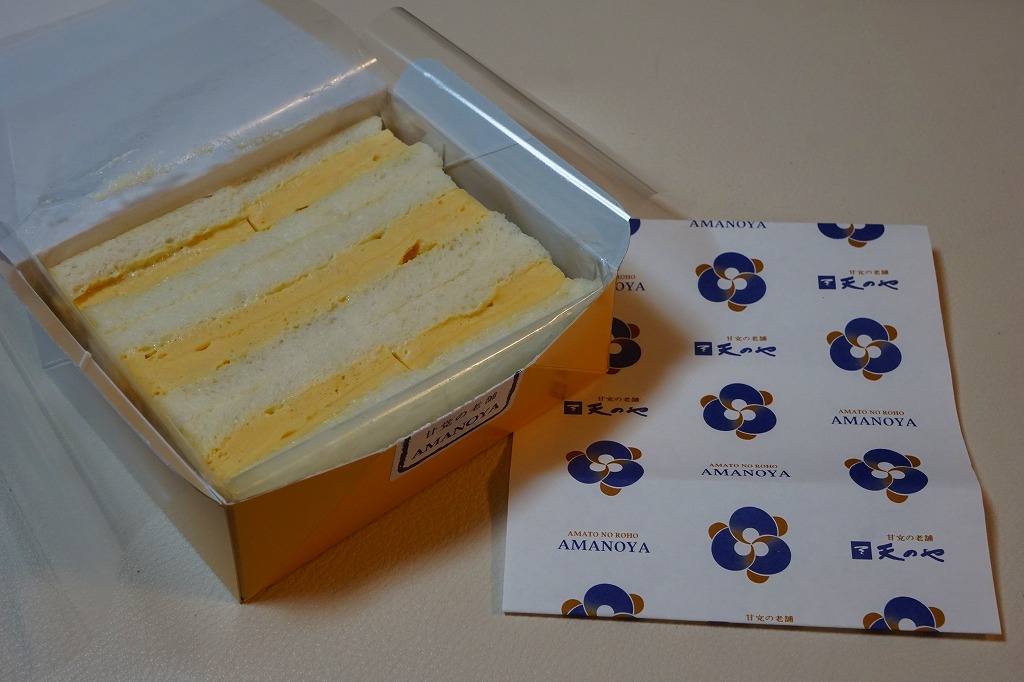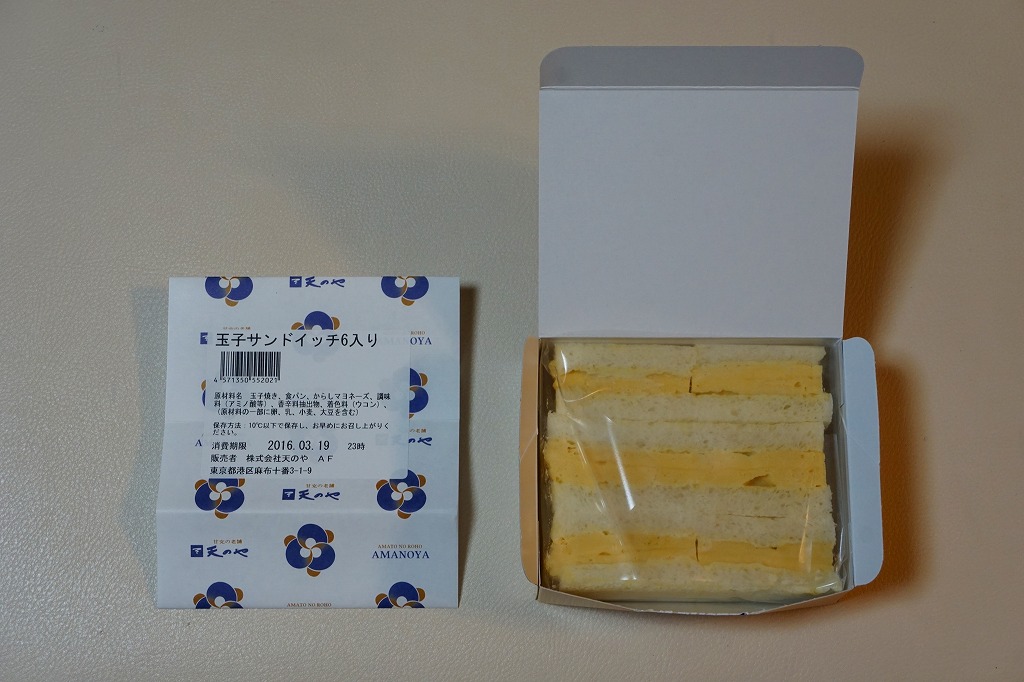 2015年か2016年頃から東京駅の駅弁売店で売られるようになったサンドイッチ。1932(昭和7)年創業の麻布十番の甘味屋「天のや」が、2015(平成27)年から関東地方各地のデパートの食品売り場で売り始めたタマゴサンド。調製元のロゴマークを印刷した専用の紙箱に、パンにだし巻き卵のみを挟んだサンドイッチを3切れ分詰める。