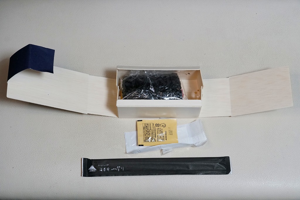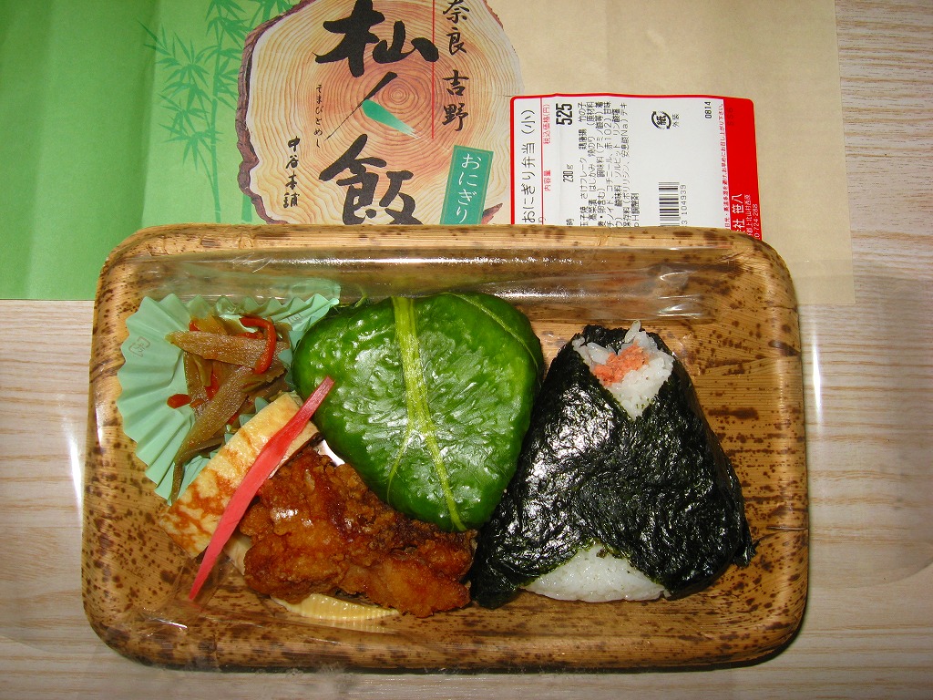 つまり、商品名どおりのおにぎり弁当。分量や価格はそんなものだろうが、この内容なのに御飯がうまくないという致命的な欠点がある気がした。調製元もスーパーの駅弁大会での属地不詳調製所不明さが気になっているところ。駅では「杣人飯」の名で様々な内容と価格の弁当をあちこちで出していた模様。それらの商品群は2016(平成28)年頃までの販売か。
