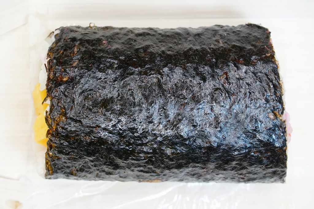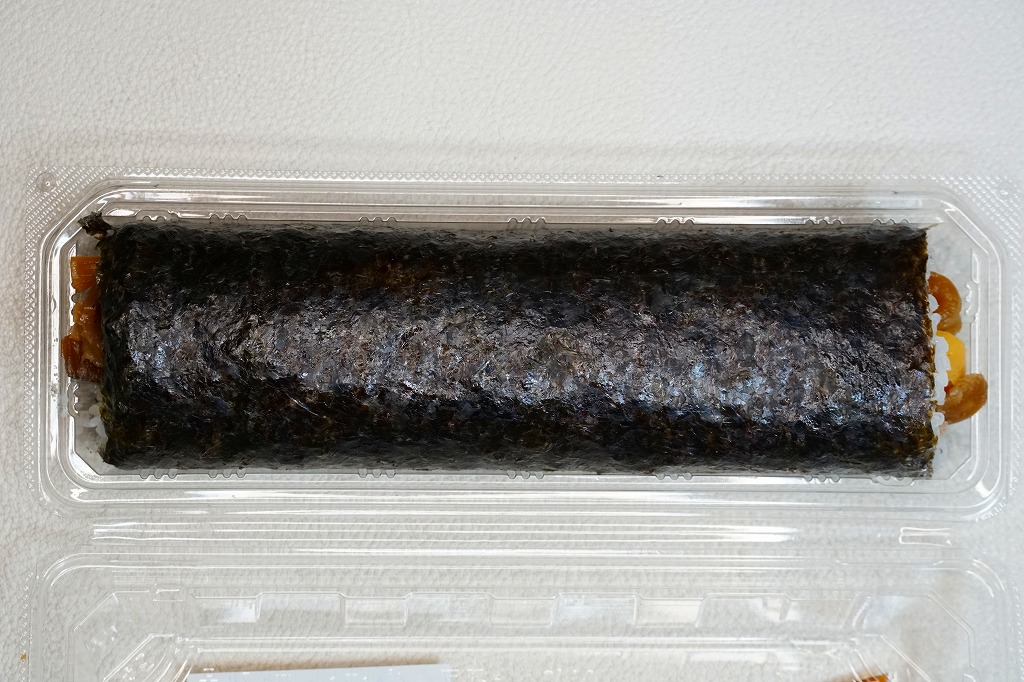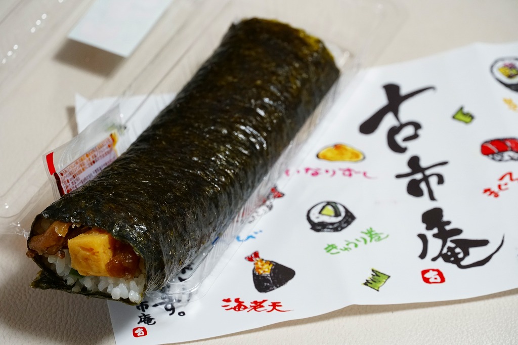 海苔巻き1本を収めた透明なプラ容器に、節分のシールを貼り、ブランドの掛紙を巻く。中身は酢飯、玉子焼、辛子明太子、えび、焼あなご、しいたけ、かんぴょう、きゅうり、カニかまぼこ、大根漬、おぼろを海苔で巻いたもの。太く短く具だくさん。これは恵方と呼ばれる方角を向いて直接かぶりつくとされる恵方巻でなく、惣菜の太巻きという感じ。