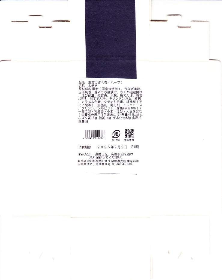 2025(令和7)年2月2日に東京駅で買えた恵方巻で、東京駅では2018年7月から売られるブランド「海苔弁山登り」のもの。木質エコ容器に短い太巻きを1個、ラップに包んで収め、掛紙を長手に巻き、醤油の袋とお手拭きと割りばしを添える。商品名に「鰻ざく巻」とあるとおりウナギのかば焼きと、玉子焼、きゅうり酢漬け、ちくわ磯部揚げ、えび、しいたけ、大葉、桜でんぶを、酢飯と海苔で巻いていた。