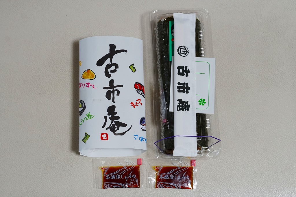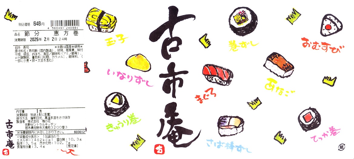 2025(令和7)年2月2日に東京駅で買えた恵方巻。下記の2022年のものと同じく、調製元の名前と持ち帰り寿司の中身の名前やイラストをちりばめた包装紙を巻いた、透明なプラ容器に細身の太巻きを1本。酢飯、玉子焼、しいたけ、かんぴょう、きゅうり、おぼろを海苔で巻いた中身も同じ。今回は醤油の袋をひとつだけ添付した。価格は2割ほどアップ。この年も東京駅では各テナントで節分に恵方巻を販売したが、このような掛紙で長めの太巻きを包む駅弁のような商品は減り、短い太巻きの惣菜が多くなっていた。