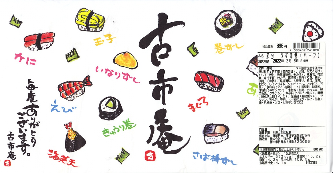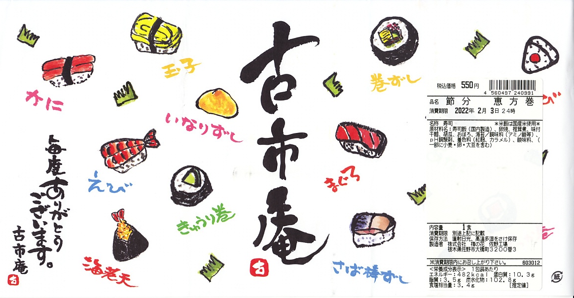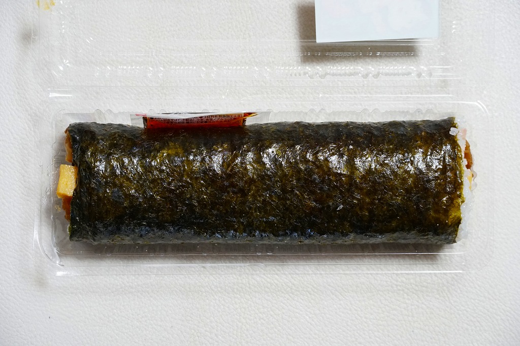 海苔巻き1本を収めた透明なプラ容器に、節分のシールを貼り、ブランドの掛紙を巻く。中身は酢飯、玉子焼、しいたけ、かんぴょう、きゅうり、おぼろを海苔で巻いたもの。奇抜や個性は見あたらない、普通のお惣菜。2000年代以降の恵方巻ブームが過熱のうえ定着し、この日の東京駅のエキナカでも各店舗が盛大に恵方巻を積んでいた。
