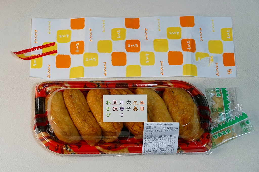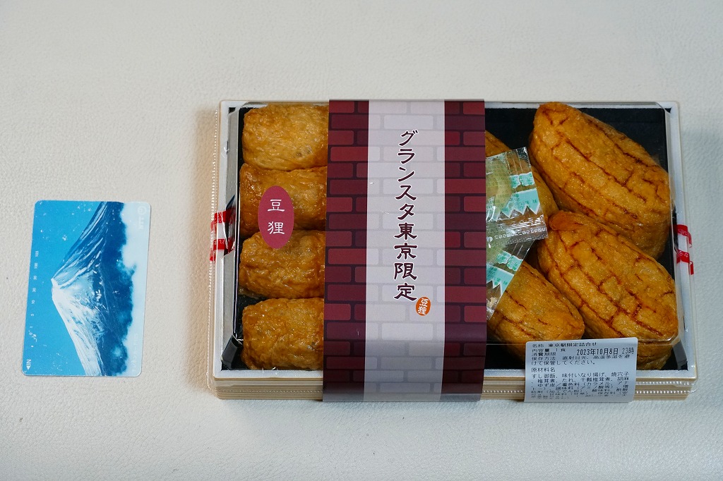 東京駅の商業施設「グランスタ」地下1階で行列ができる、全国の大都市にチェーン店を展開する大阪梅田のいなりすし専門店「豆狸(まめだ)」で買えた商品。上げ底の激しい容器に巻いた掛紙での商品名は「グランスタ東京限定」、食品表示ラベルでの商品名は「東京駅限定詰合せ」とあり、東京駅構内でのみ売られる商品とみられる。