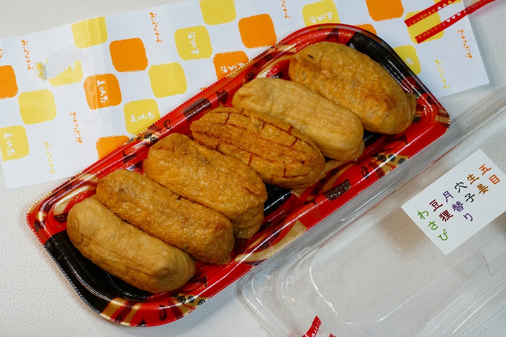 中身は稲荷寿司が8個。うちプレーンの「豆狸いなり」が4個と、グランスタ東京限定と紹介され煉瓦積みの焼き目を付けた穴子いなりが4個。お揚げの水気か出汁が豊かに思える、食べれば普通の稲荷寿司。この店の商品は、ネットメディアでは東京駅限定お弁当売上ランキング第2位などの言い方で、東京駅の駅弁のように紹介される。価格は2023年の購入時で1,468円、2025年時点で1,591円。