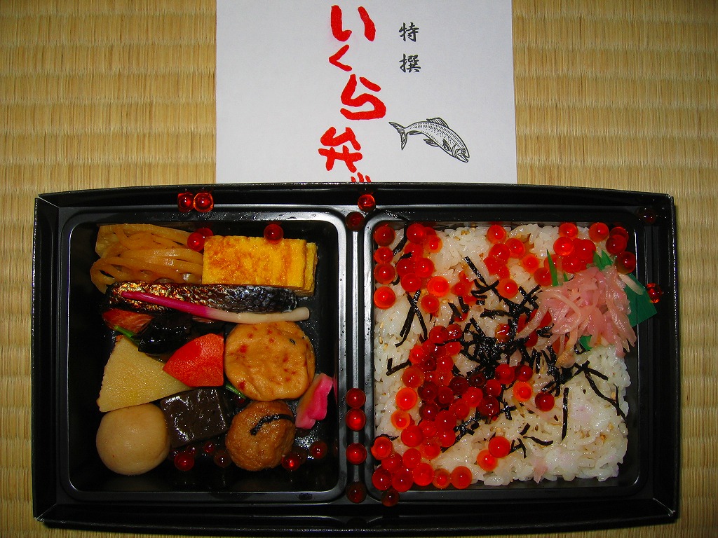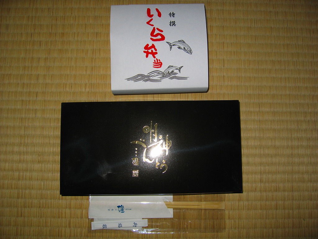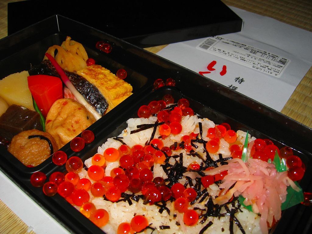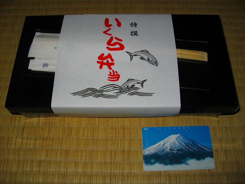 駅弁を食べ過ぎていると、北海道や東北ではなく東京駅にあることに違和感を覚える商品名。黒塗り金文字で高級感を出した長方形のボール紙容器に、その対極を行く簡素な掛紙を巻いて、セロハンテープで留める。中身は半分がイクラ酢飯、半分が鮭粕漬と玉子焼の他は細々とした煮物を詰め込むおかず。