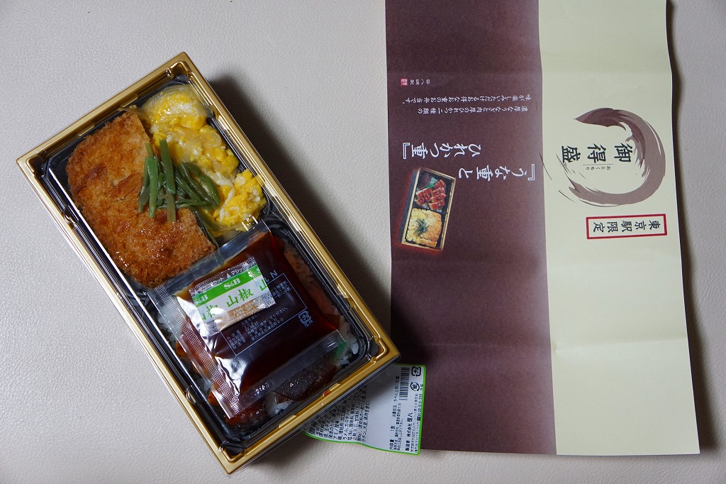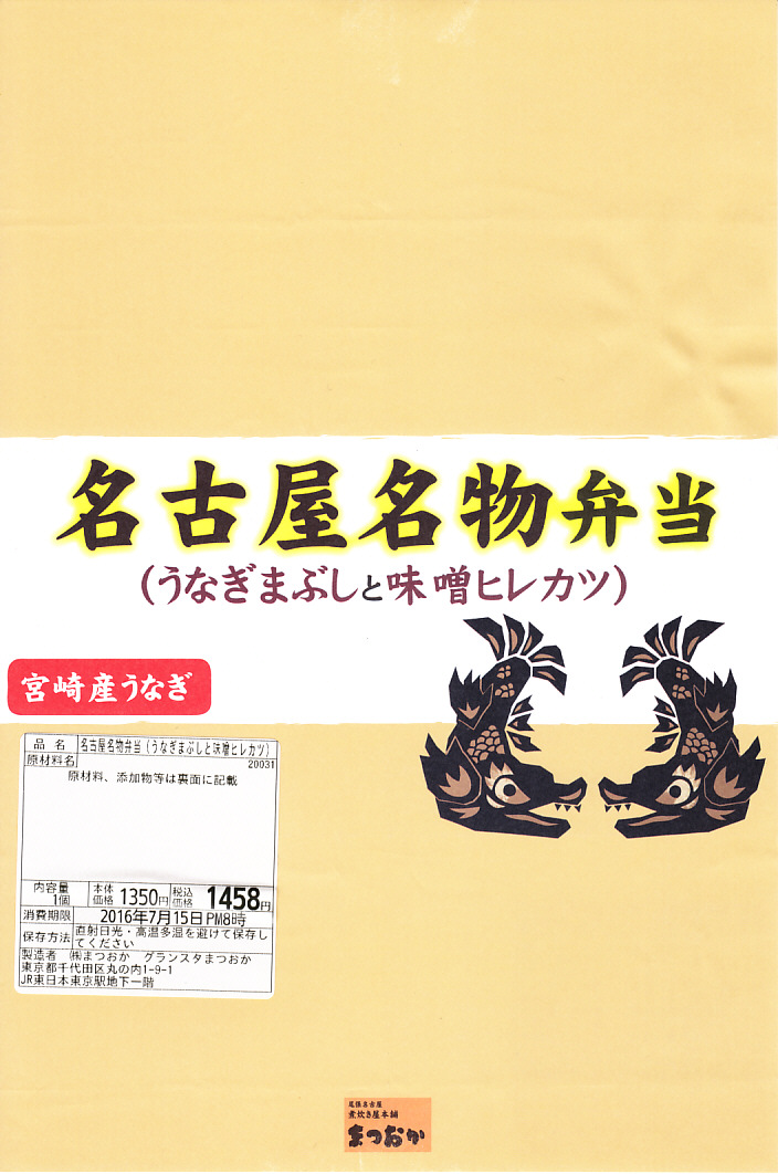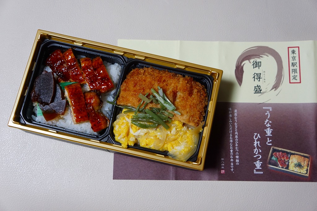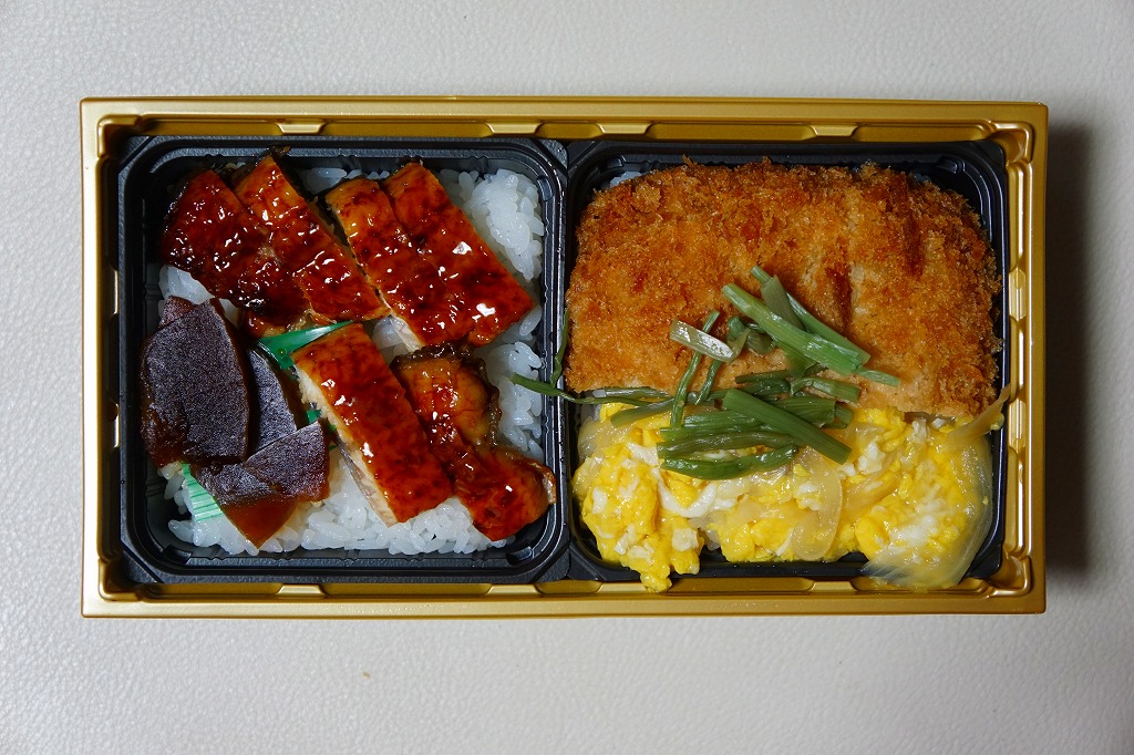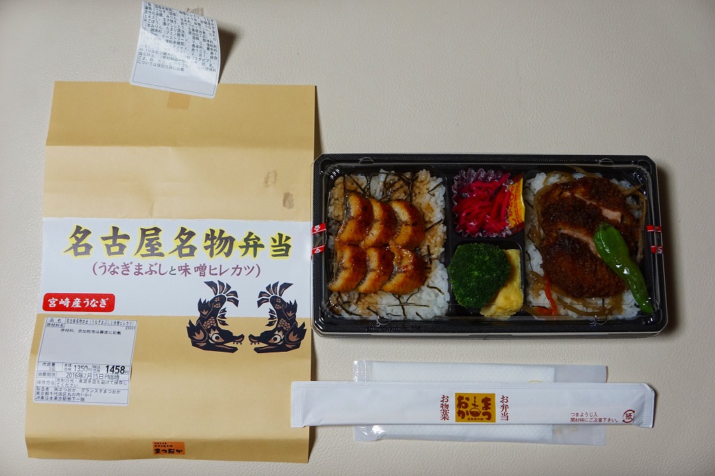 東京駅構内の商業施設「グランスタ」で買えたお弁当。調製元は名古屋、東京、大阪の各地の商業施設に店舗を展開する惣菜屋ないし食品業者であるため、この弁当も東京駅に限らず各地で売られるものと思われる。中身は白御飯が多め、具が少なめの、鰻丼とカツ丼の組合せ。これを名古屋っぽく表現して、「うなぎまぶしと味噌ヒレカツ」となる。見た目どおりの味がする、デパ地下の惣菜弁当。駅弁屋と違い、ここでは各テナントが店内で弁当を調製している。2016〜2017年の販売か。