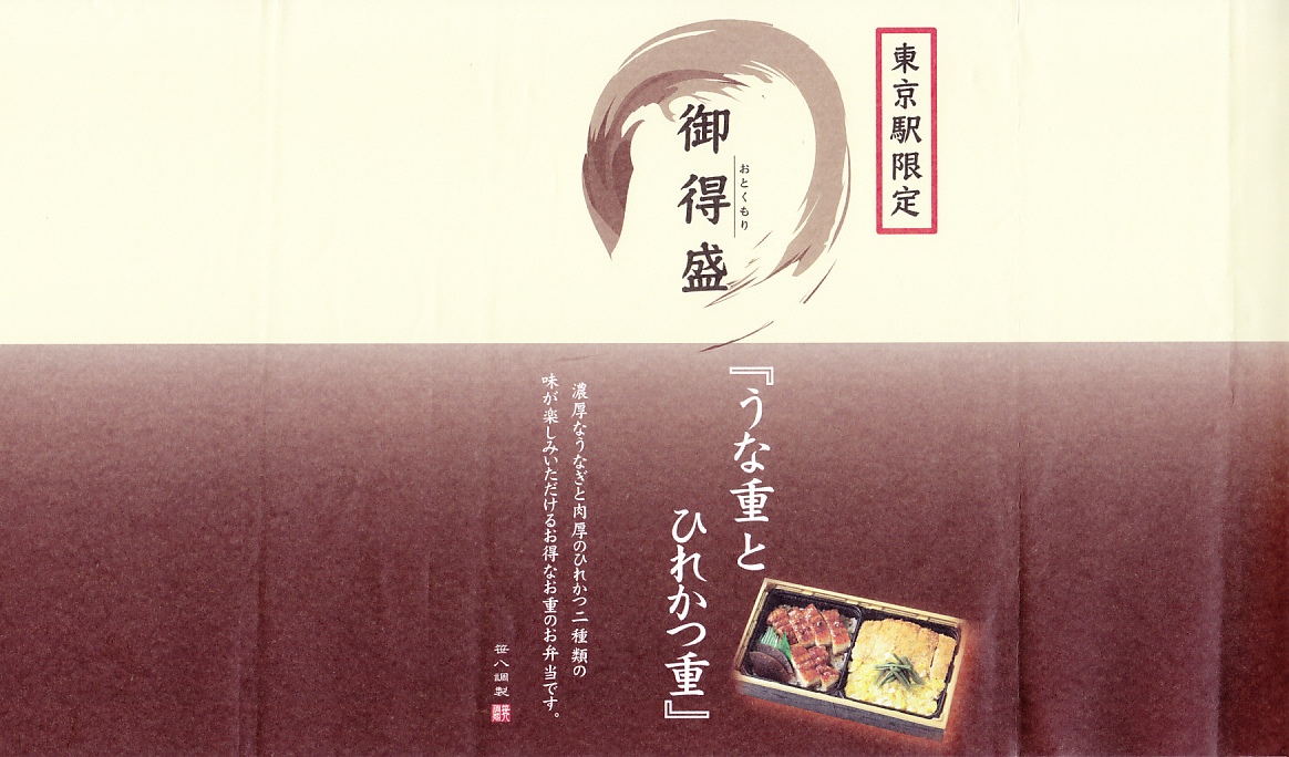 東京駅構内の商業施設「グランスタ」で買えたお弁当。商品名と宣伝文と中身の写真をシンプルに描き、まるで駅弁のように容器を覆う掛紙に、「東京駅限定」の文字がある。中身はその名のとおり、鰻重とヒレカツ重。白飯にウナギの蒲焼きの刻みと漬物を載せたトレーと、白飯をヒレカツと卵とじで覆ったトレーが、ひとつずつ入る。印象はその名に違い、価格と比べた御得感はとくになし。大都会のどこにでもある笹八なので、地域感も無し。2016年から2017年までの販売か。