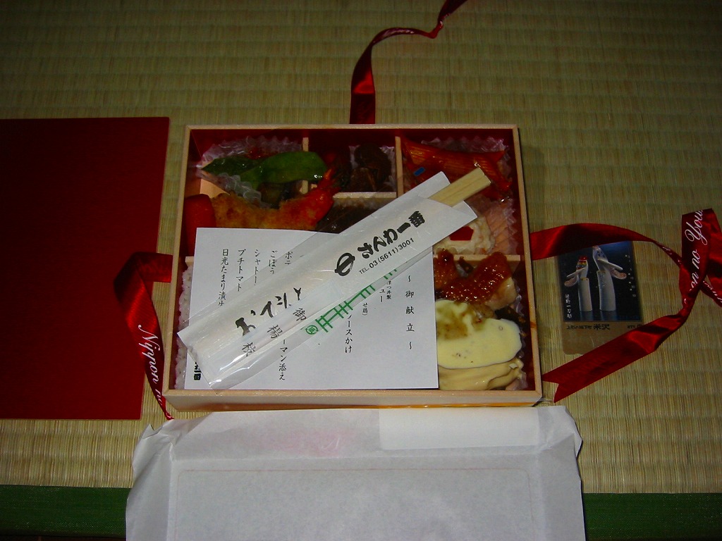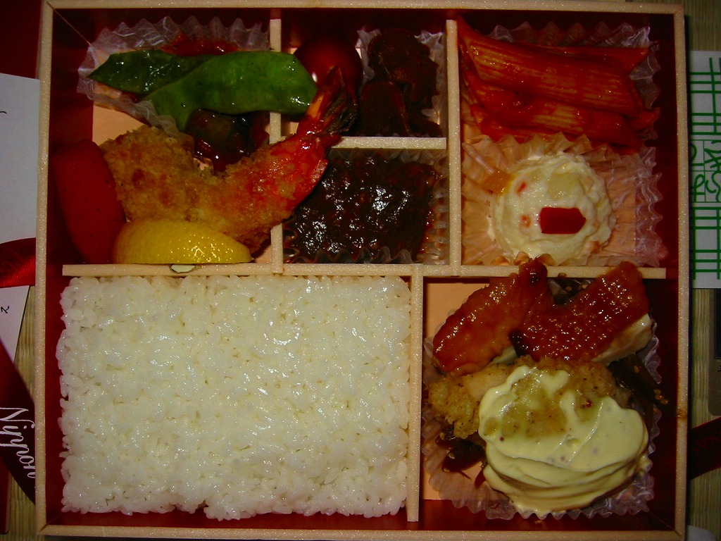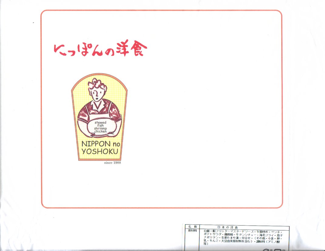 内面だけ朱塗りで高級風な長方形の容器に白い掛紙をかけて真っ赤な専用のリボンで見栄え良くしばる。中身はプレーンな白御飯にタンシチュー、鶏照焼、鮭マスタードソース、海老フライ、パスタ、ポテトサラダなど。なんでもない御飯と箸も内容を演出する、洋食という言葉が生きていた時代を反映させている和風洋食弁当。東日本キヨスクの弁当売店「膳まい」での取り扱い。現存しないのではないかと思う。
