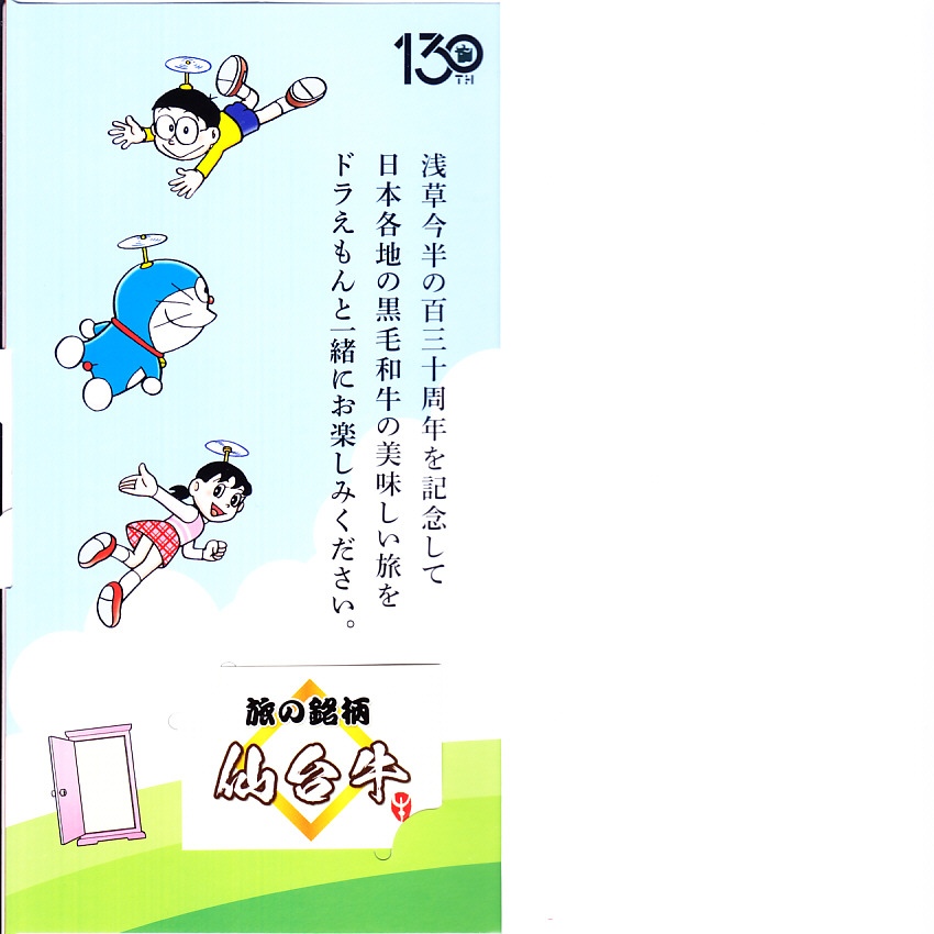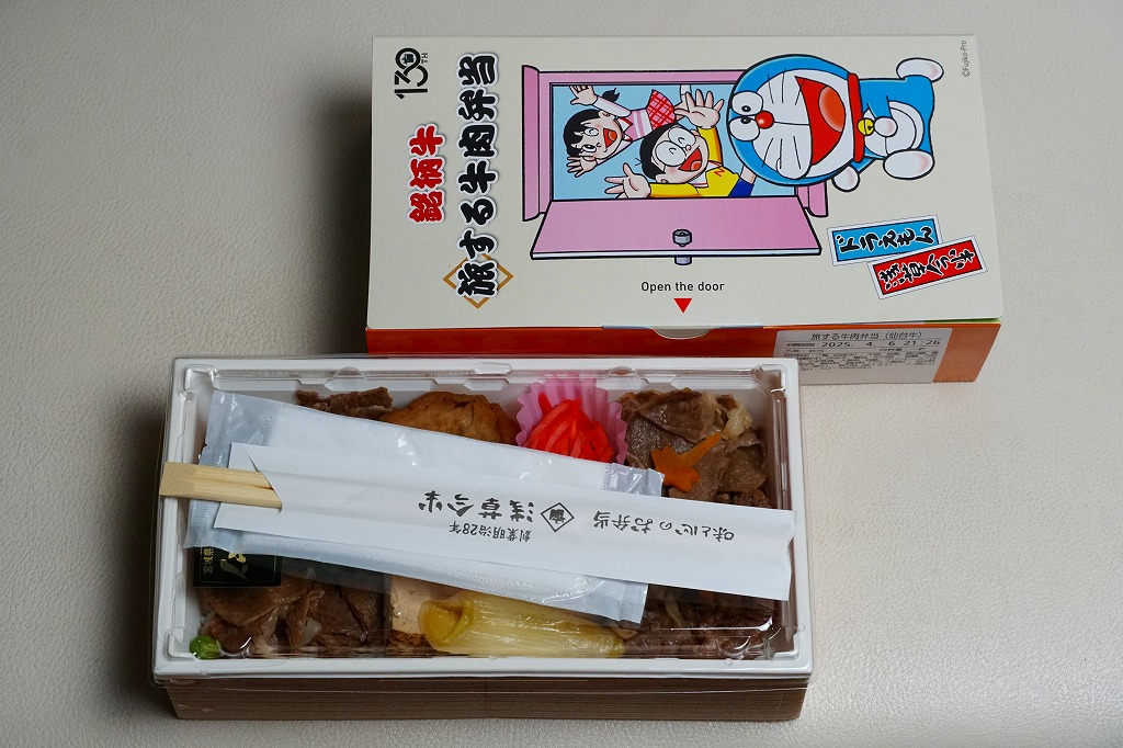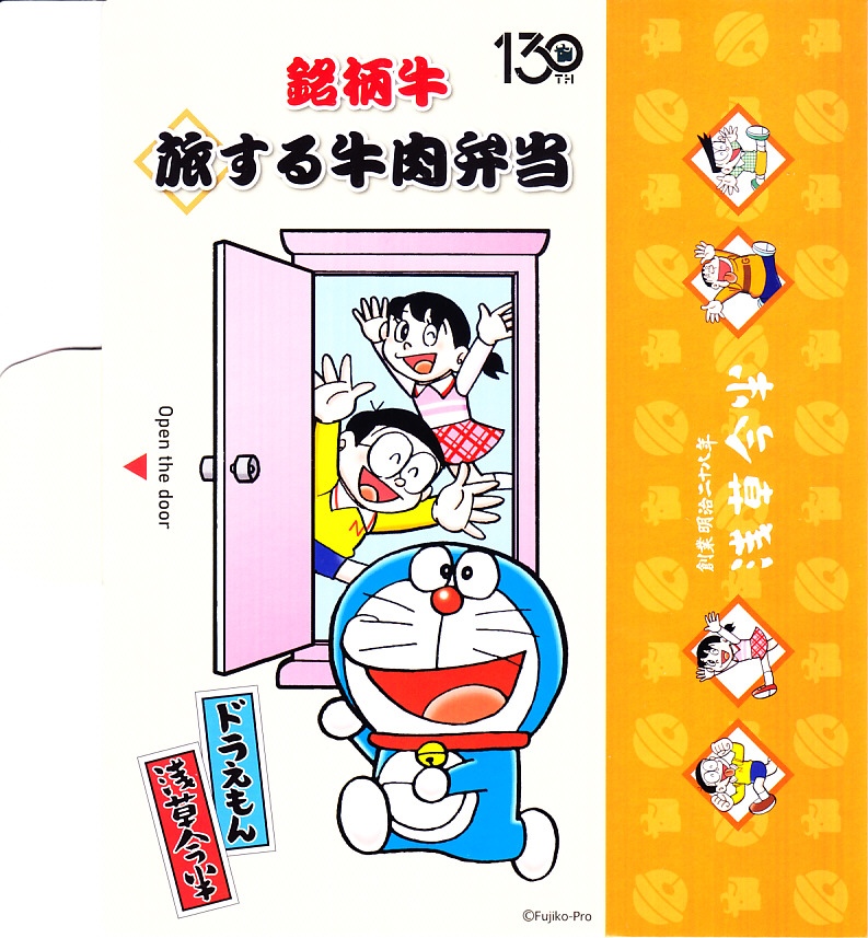浅草今半創業130周年を記念し、2025(令和7)年4月1日から期間・数量限定で、同社の日本全国の弁当売場で販売。東京駅でも買えて、「旅する」という文字もあり、まるでドラえもんのキャラクター駅弁にも見える。藤子・F・不二雄の連載漫画「ドラえもん」で半世紀以上深く親しまれ、誰もが見てわかると思うキャラクターを、スリーブに描き、扉を開けてもまた描かれる。中身は白御飯を銘柄牛の牛肉煮と長ねぎ、焼豆腐、油麩、紅生姜で覆い、にんじんとグリーンピースで彩るもの。風味はいつもの浅草今半ブランドで、薄手で柔らかい牛肉の赤身やざらつきがとてもおいしい、醤油味の高級な牛すき焼き弁当。