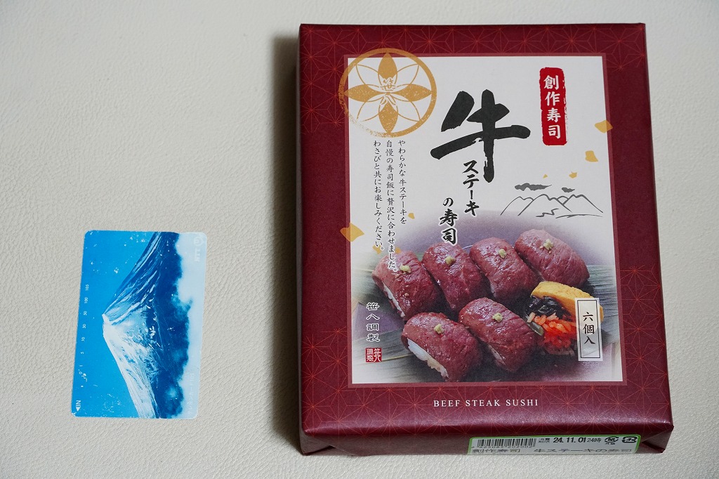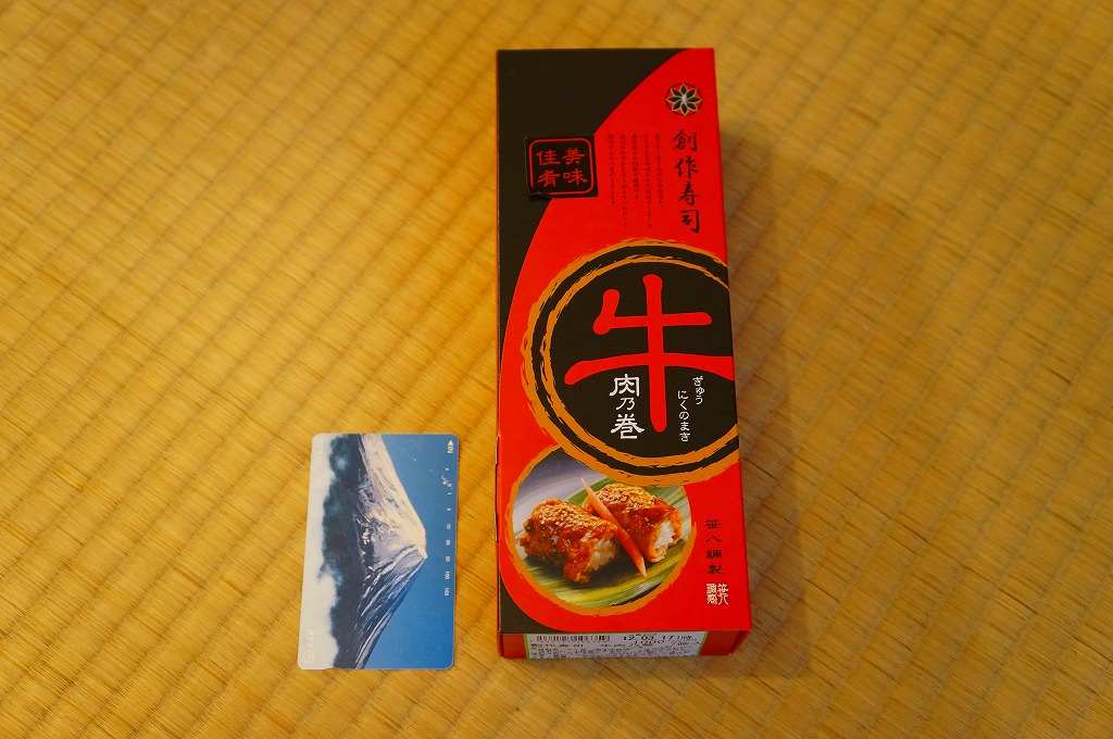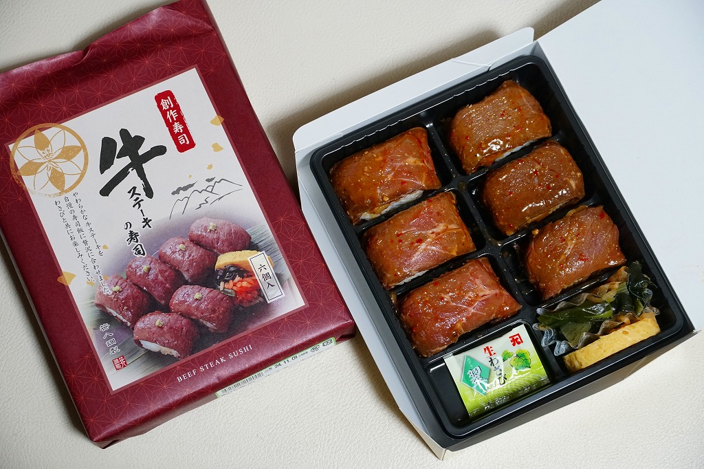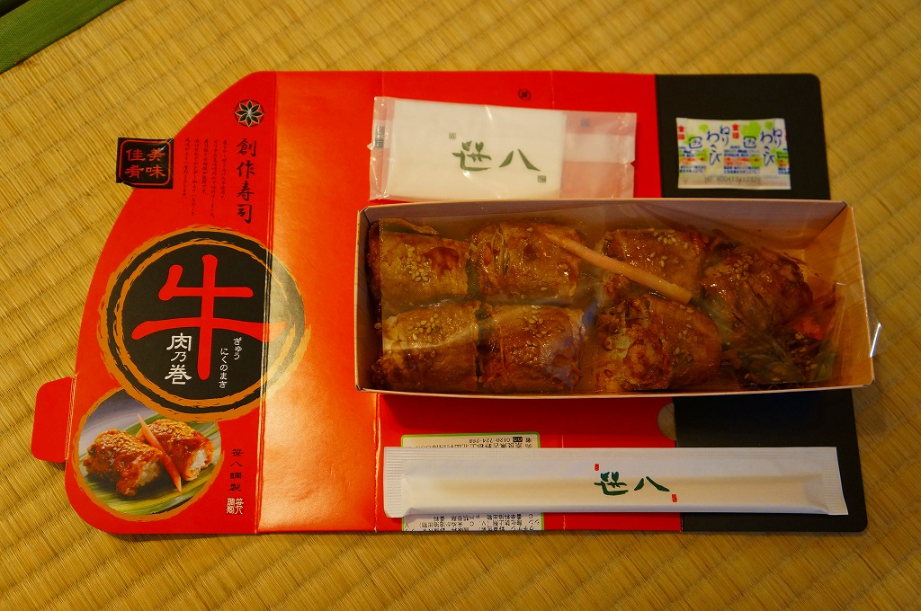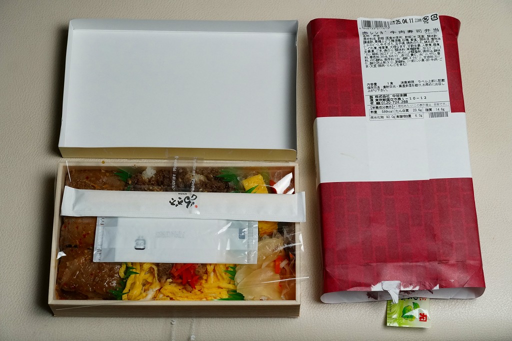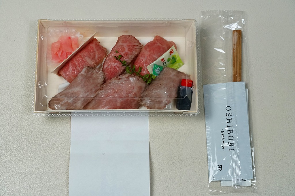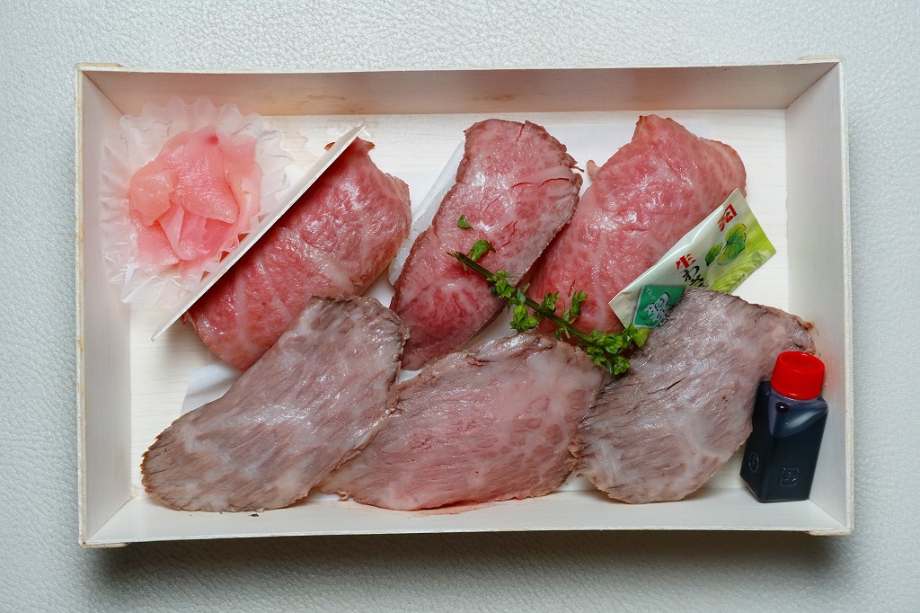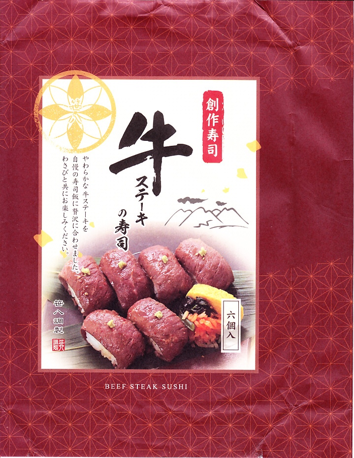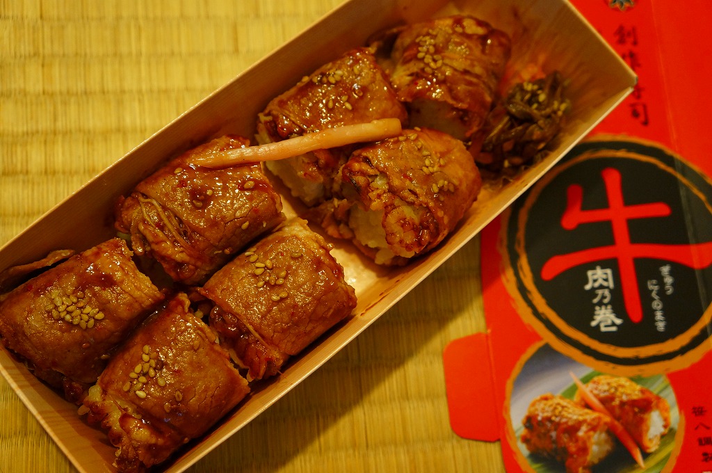 東京駅構内の商業施設「グランスタ」の、地下1階の食品売り場「スクエアゼロエリア」内のお弁当・惣菜ゾーンのリニューアルに合わせて、2024(令和6)年4月24日に発売。店舗に「東京駅限定」の掲示があったものの、東京を中心に全国でチェーン展開するテナント「肉処壱丁田」「博多肉の壱丁田」「和牛の壱丁田」で買える模様。霜降りまたは赤身ランプの肉寿司を6個、木質エコ容器に並べて、商品名の掛紙を巻く。これは「霜降り&赤身」で、それぞれ3個ずつ入っていた。見るからに高価な、薄く上品でほぼ味のない牛肉の巻き物。