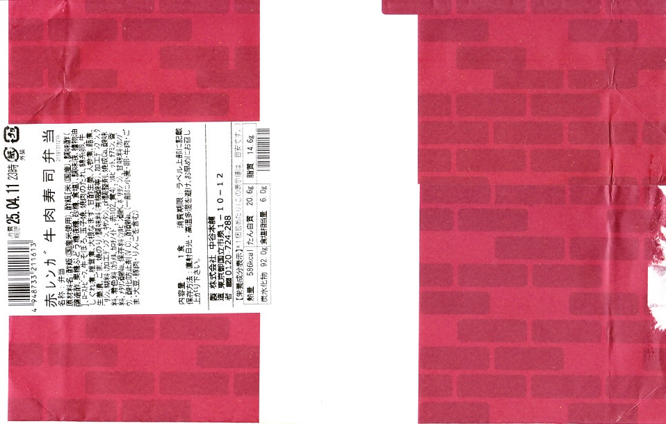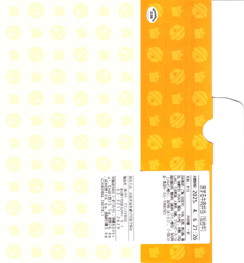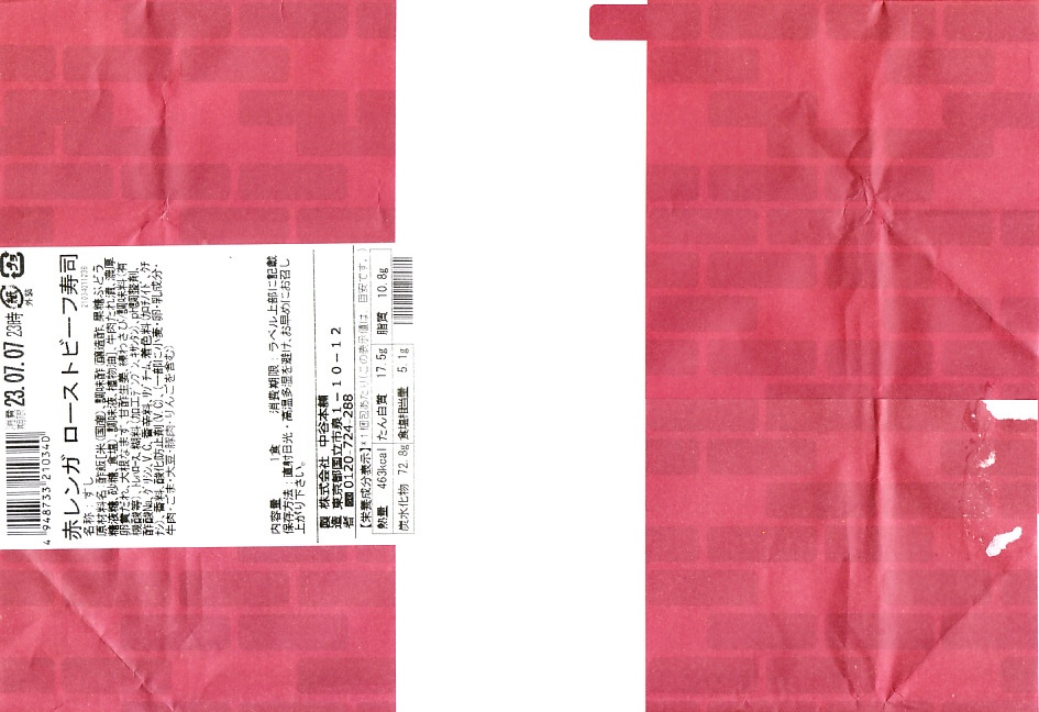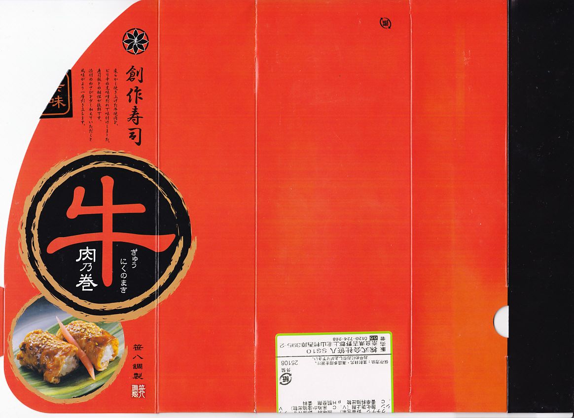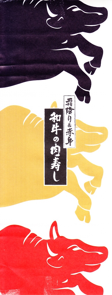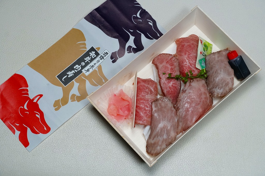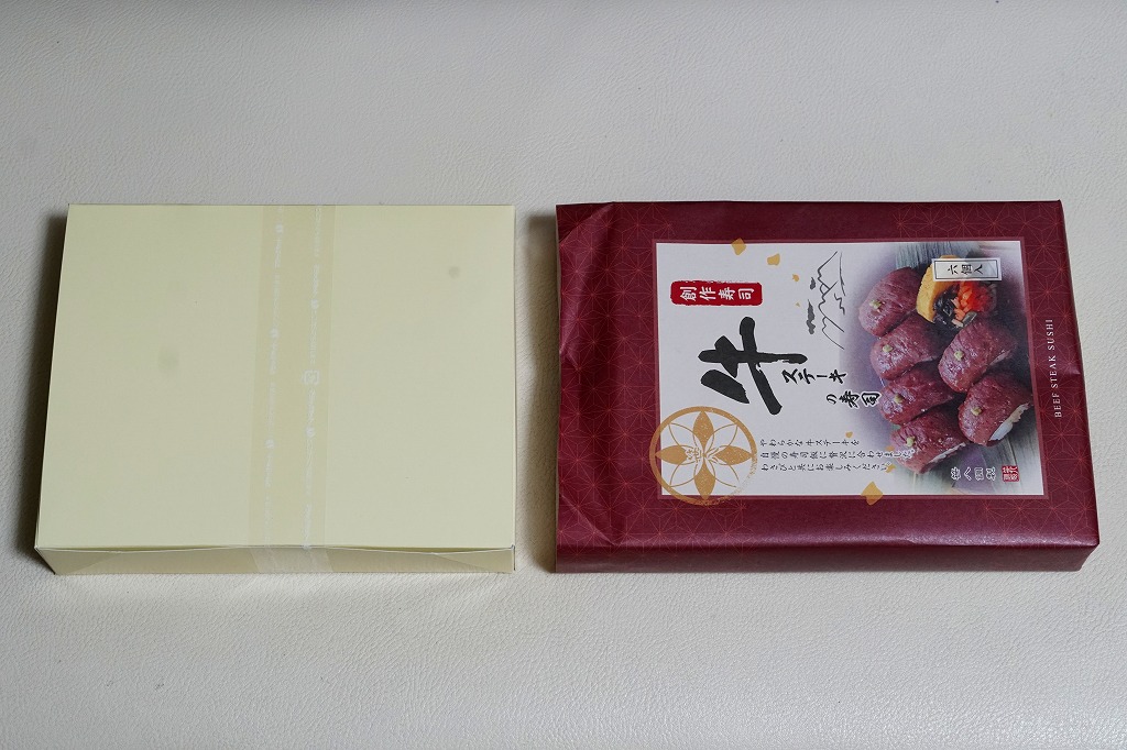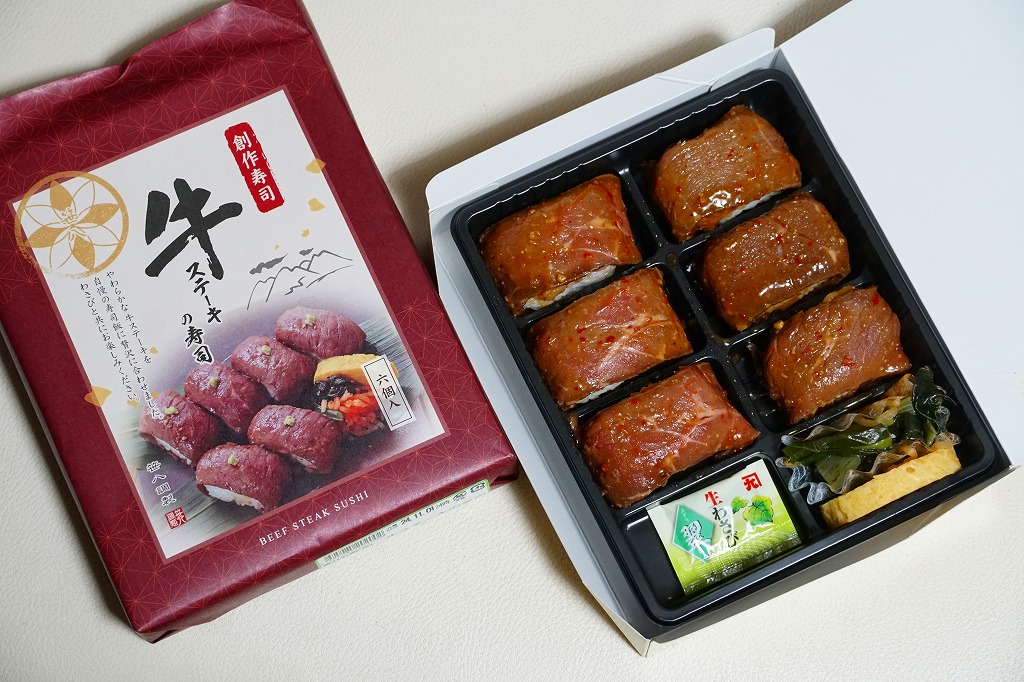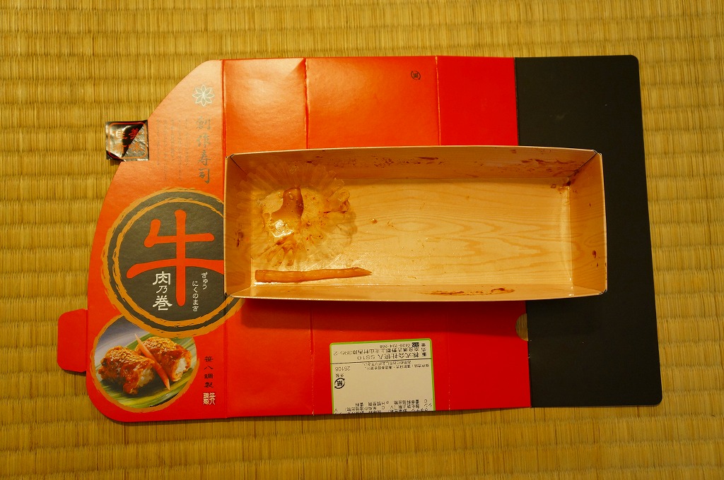 東京駅構内の商業施設「グランスタ」の、地下1階の食品売り場「スクエアゼロエリア」内のお弁当・惣菜ゾーンのリニューアルに合わせて、2024(令和6)年4月24日に発売。店舗に「東京駅限定」の掲示があったものの、東京を中心に全国でチェーン展開するテナント「肉処壱丁田」「博多肉の壱丁田」「和牛の壱丁田」で買える模様。霜降りまたは赤身ランプの肉寿司を6個、木質エコ容器に並べて、商品名の掛紙を巻く。これは「霜降り&赤身」で、それぞれ3個ずつ入っていた。見るからに高価な、薄く上品でほぼ味のない牛肉の巻き物。