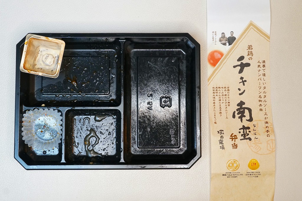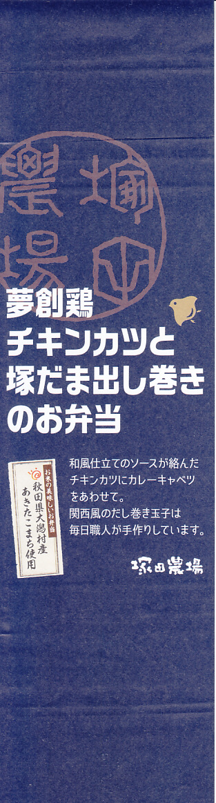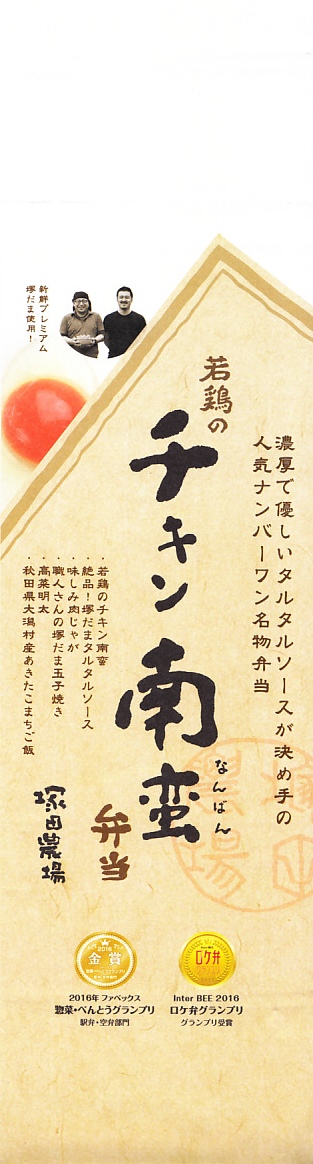 2016(平成28)年までに発売か。白御飯とチキン南蛮とタルタルソースと、肉じゃがと玉子焼と高菜明太のお惣菜。お米には秋田県大潟村産あきたこまちを、玉子焼には自社ブランド卵「塚だま」を使用するのだという。駅弁として認識されることのない、デパ地下弁当や仕出し弁当だと思ったが、これがファベックス展の「惣菜・べんとうグランプリ2016」の駅弁・空弁部門で、「塚だまタルタルの特製チキン南蛮弁当」の名で金賞となった、つまり駅弁や空弁として考えられているようなので、購入してここに収蔵した。品川駅や上野駅の駅弁として好んで買って食べる人はいるようだ。