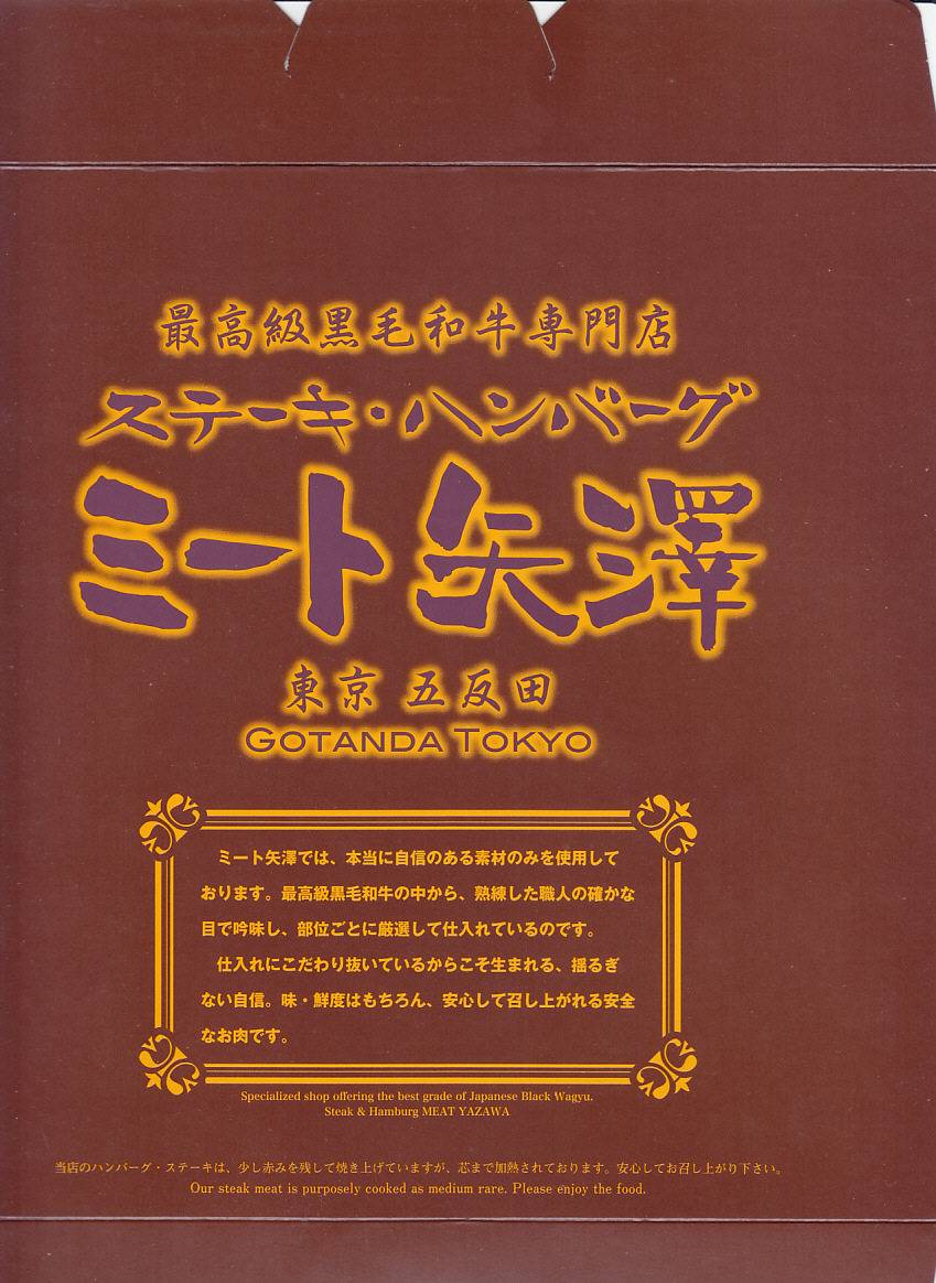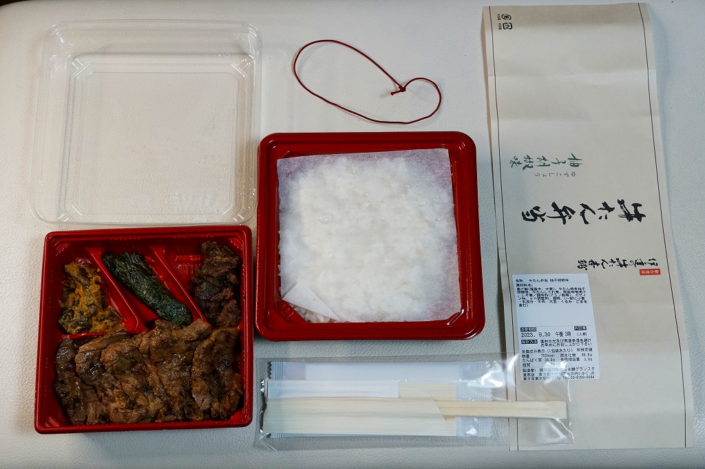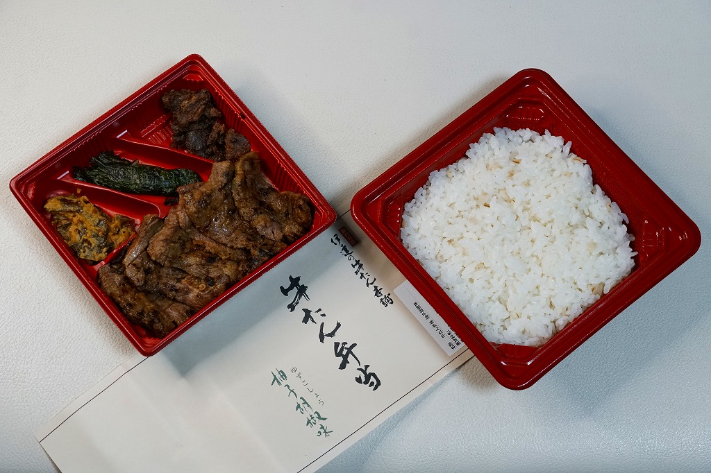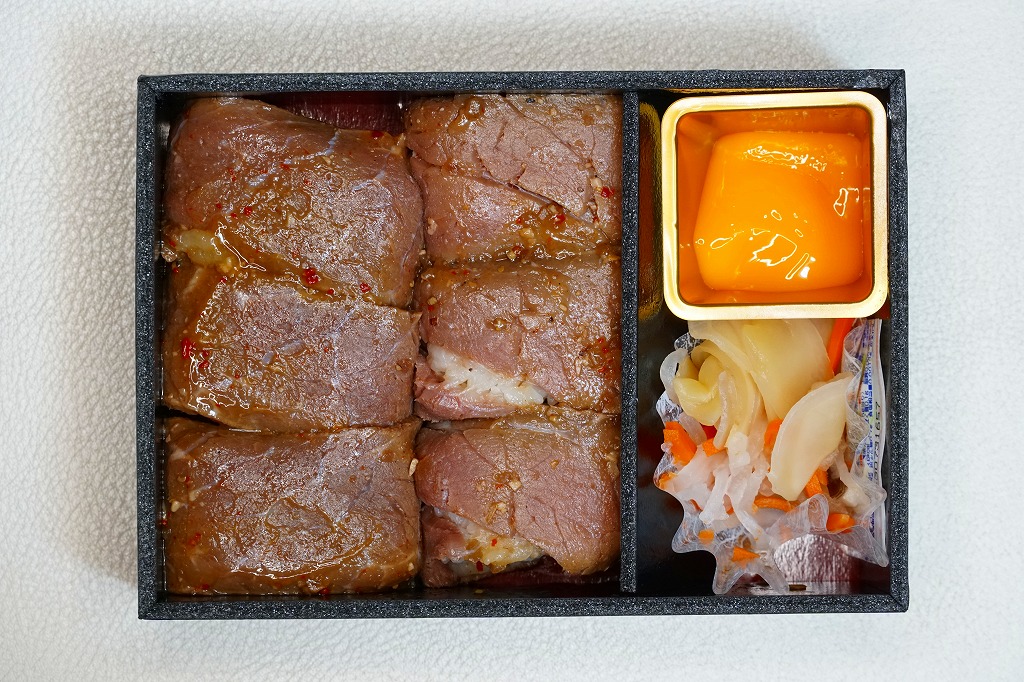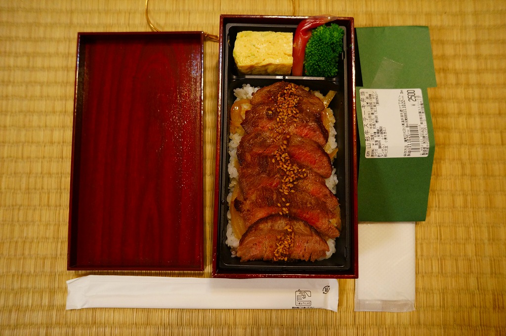 山形牛の通信販売を行う横浜市富岡の精肉店が出した東京都銀座の牛肉料理屋が、東京駅限定で販売する牛肉弁当なのだとか。実物でも店舗でも宣伝がないため、単なるデパ地下弁当にしか見えない。脂質も味付けも分量もあっさりとしたおとなしい感じで、叙々苑や米沢駅の駅弁に比べ、デザインも含めて地味な印象。購入後ほどなく販売を終了したとも聞く。