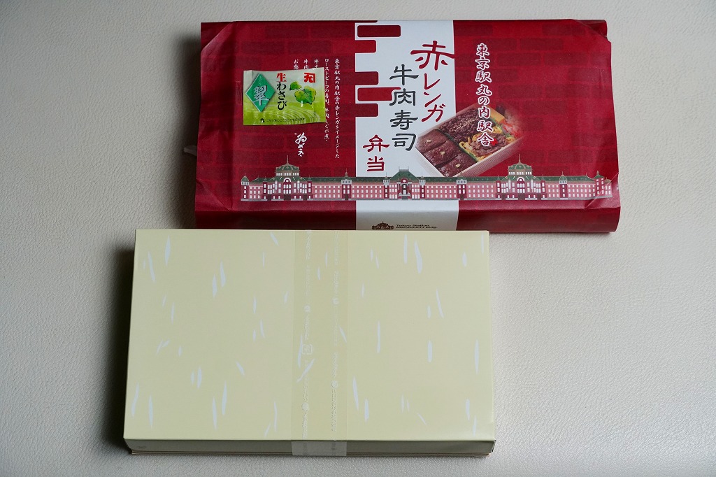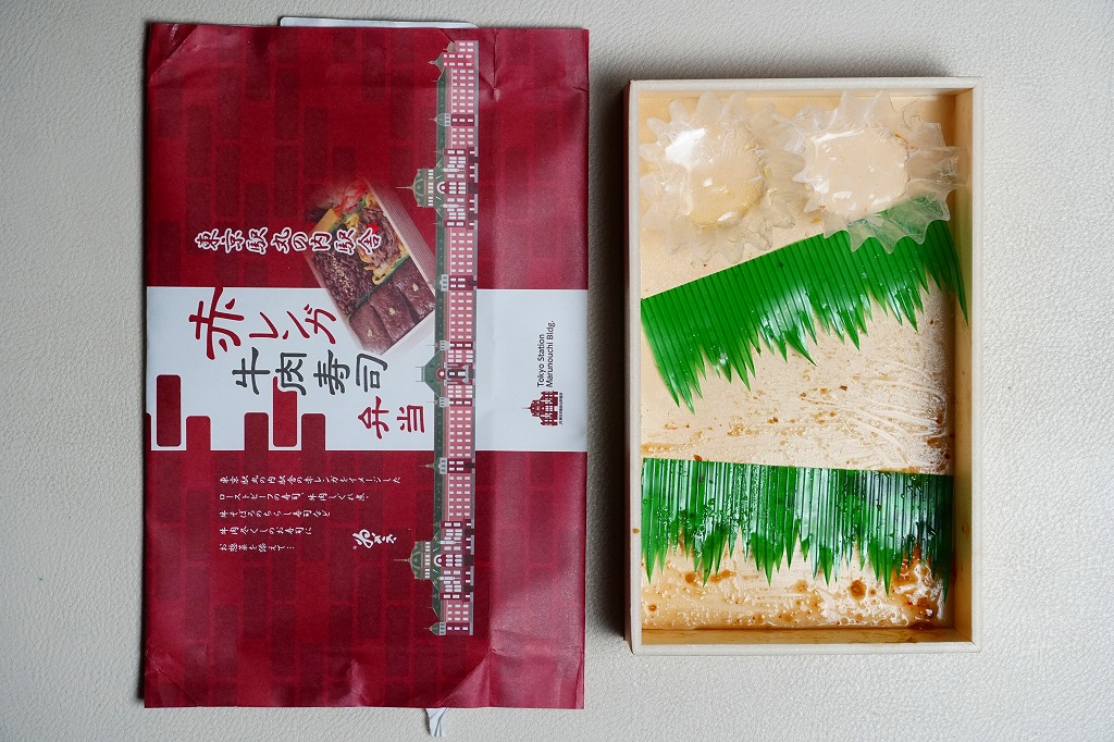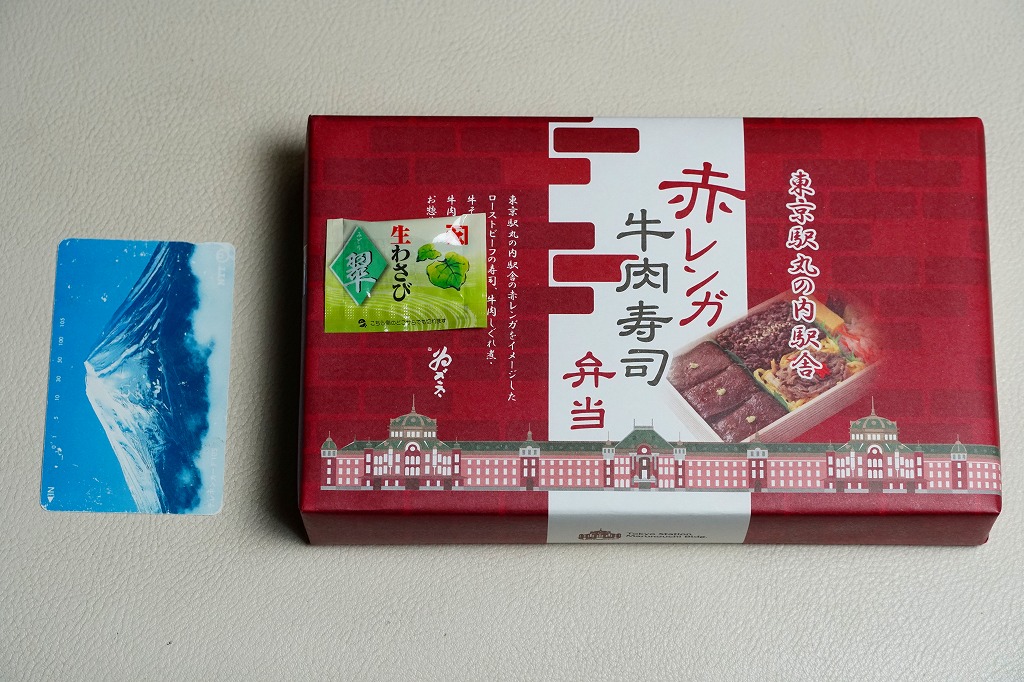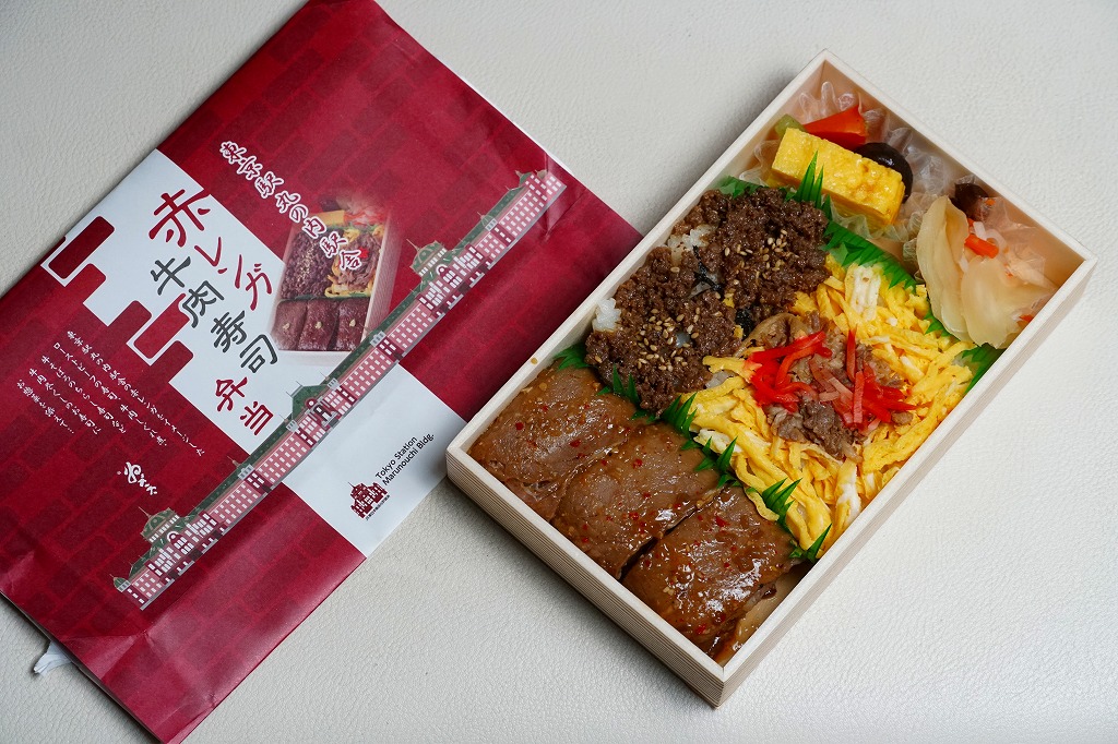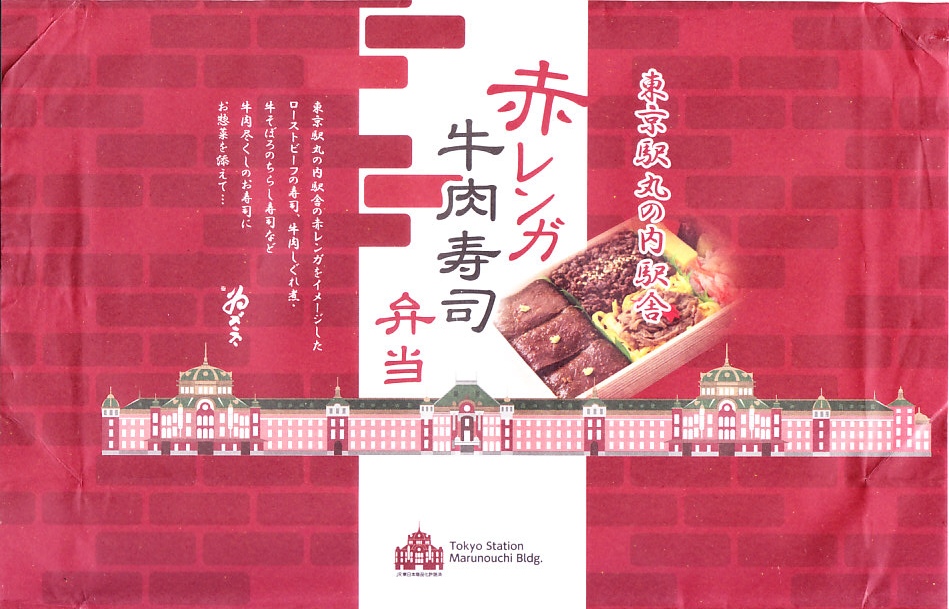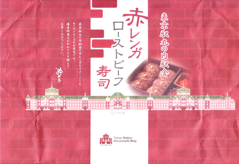 2022(令和4)年の9月までに、東京駅で発売か。東京駅の商業施設「グランスタ」地下1階の食品売り場のテナントのうちいくつかで、ここ限定の弁当を販売していることを、この頃までに壁広告として現地に掲示した。これは奈良吉野を名乗り関東と関西の都心で様々な店名にて手広く柿の葉寿司などを販売する業者の商品。包装紙は東京駅丸の内駅舎や煉瓦積みのイラストに、中身の写真でデザインされた。中身はローストビーフ寿司が6個と、卵黄、大根なます、甘酢生姜、わさび袋。メインの寿司は焼肉のたれを肉に漬けて飯に浸透し、ローストビーフというよりはむしろ牛焼肉の味がした。