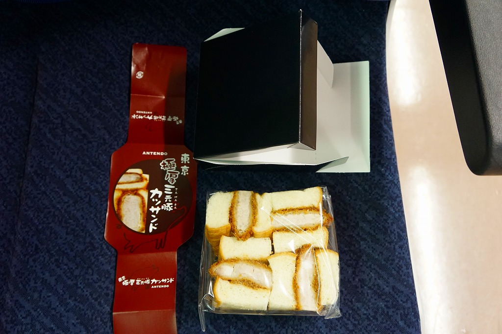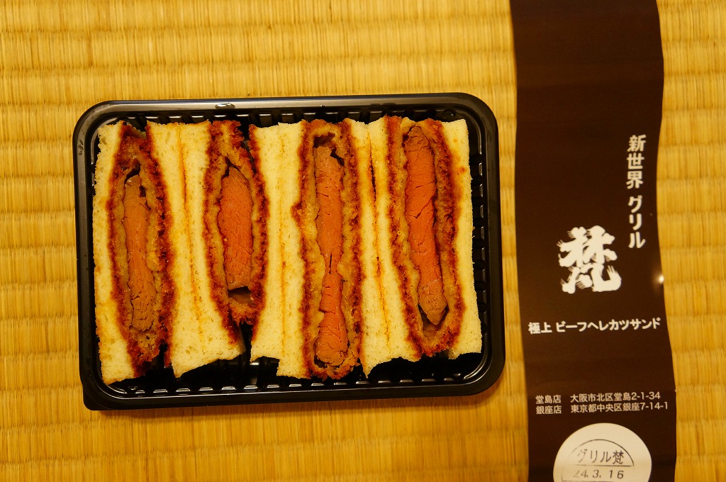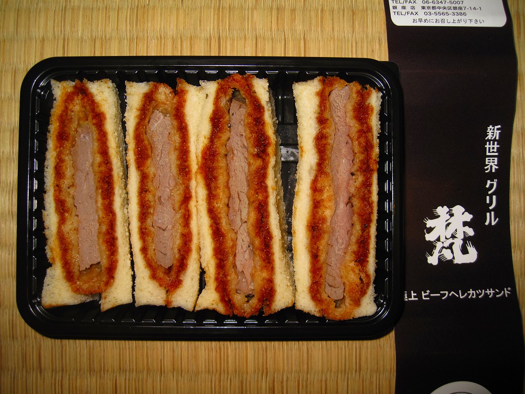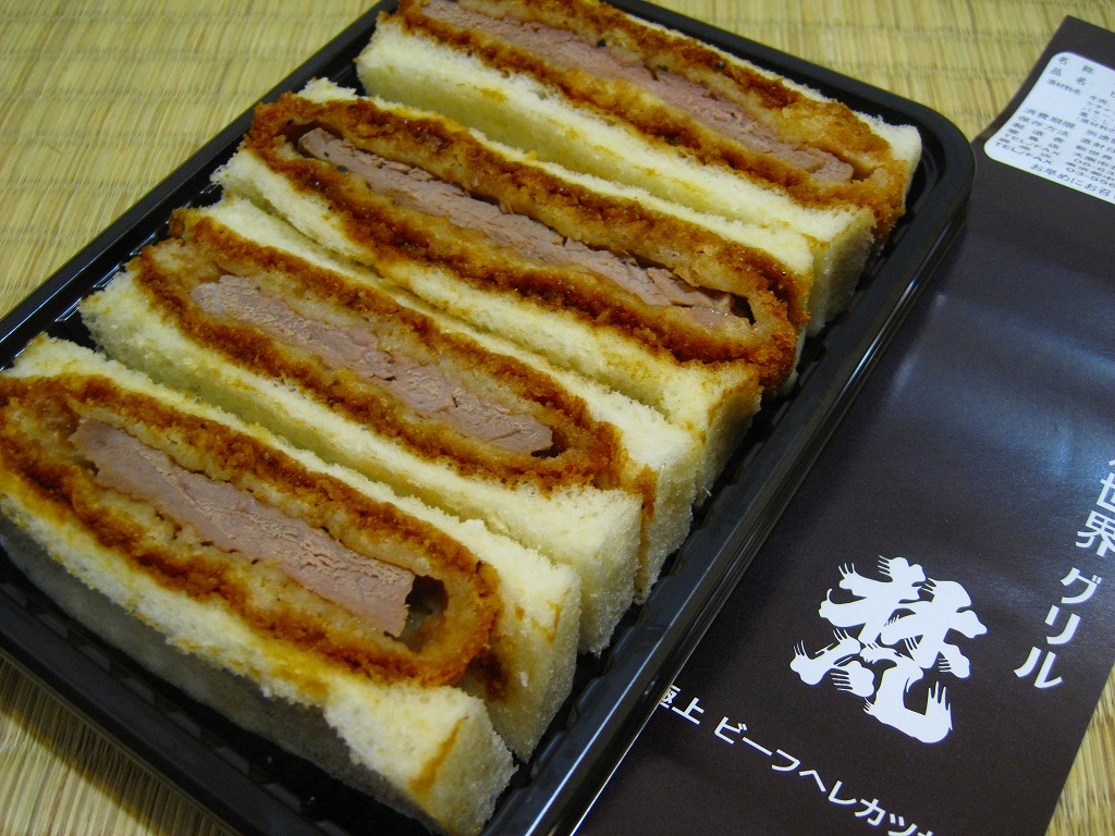 東北新幹線新青森開業に合わせて、2010(平成22)年12月4日に開業した東京駅構内食品街「グランスタダイニング」内の駅弁売店「ニッポンの駅弁」で駅構内デビュー。プラ製のサンドイッチ向け惣菜容器に、ブランドネームや商品名を印刷したソース色の紙を巻く。中身は牛肉のヒレカツサンドが4切れ。この分量で1,000円も取るのだから駅売りサンドとしては超高級品。牛肉サンドにありがちな肉の少なさや固さや香りの少なさとは無縁な、味にも歯応えにも弾力感と柔らかさを備える傑作。