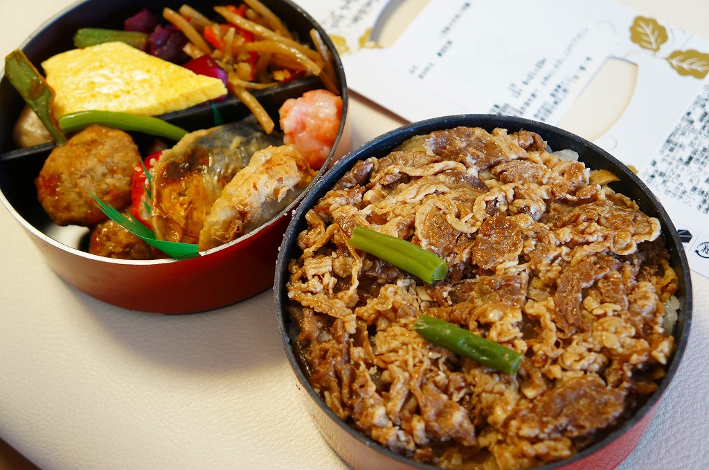 黒地に朱塗りの丸いプラ製容器の中身は、下段が牛丼、上段がおかずで玉子焼、サワラ西京焼、鶏つくね串、レンコン挟み揚げ、ささがきごぼう、ニンジンやサトイモなどの煮物、しば漬けなど。見た目のとおり、駅弁以上にしっかりしっかり濃い味付け。