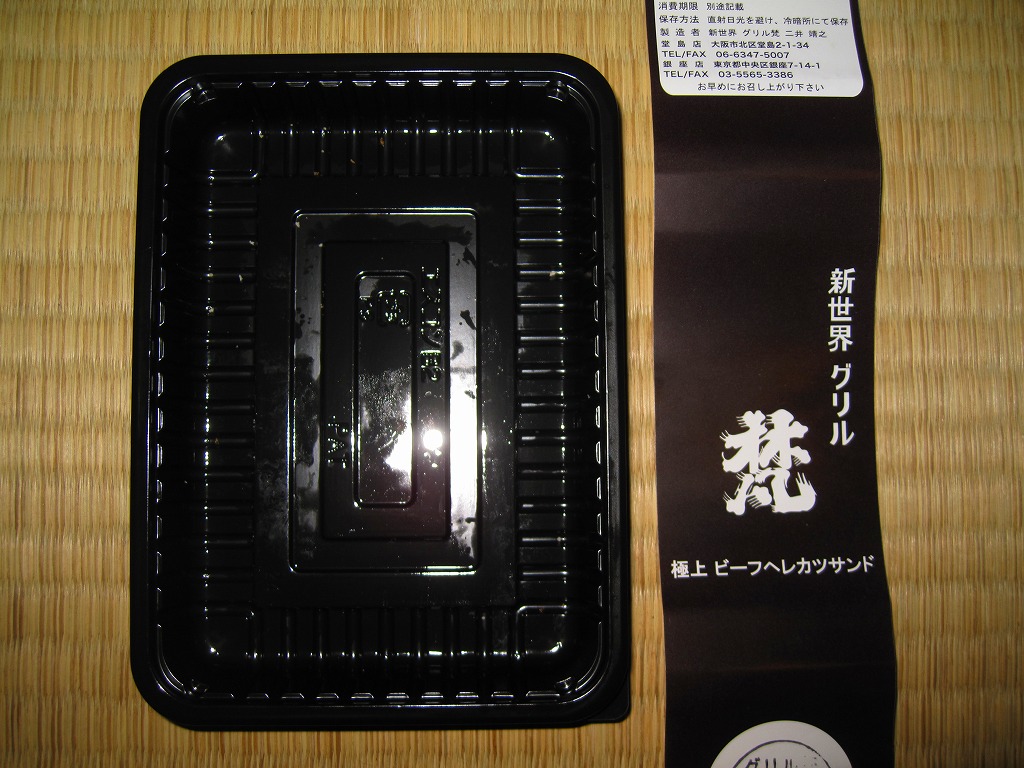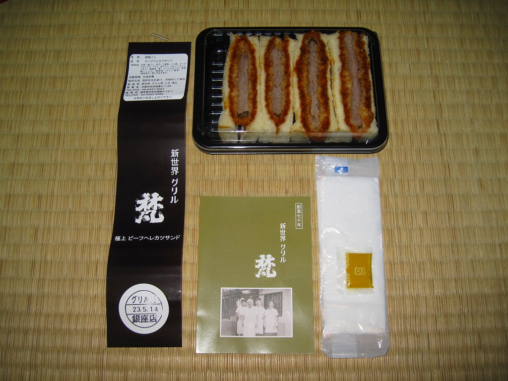 「新世界」や「ヘレカツ」の単語から感じられるように、調製元は大阪ミナミの歓楽街で1937(昭和12)年に創業した洋食屋。2008年に東京銀座にも進出し、両店でこのサンドイッチも販売や配送を実施しているそうな。これは「ハーフ」のようで、「一人前」だと2,000円にもなる。レストランで注文すると1,890円。