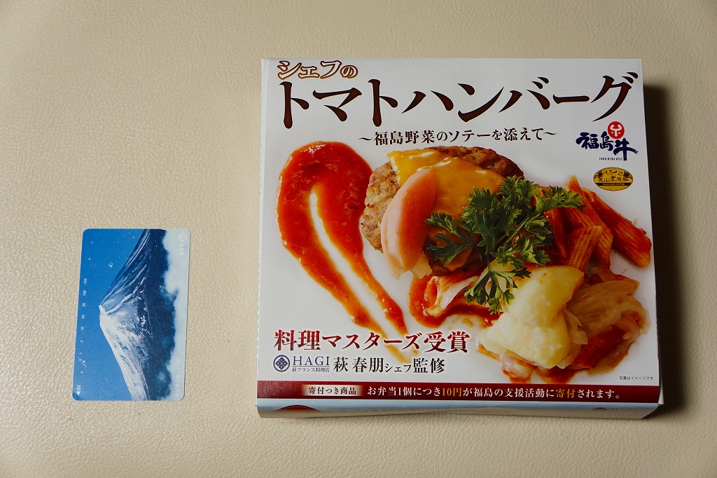 中身のイメージ写真が美しい掛紙では、その表と裏で福島県いわき市内のフランス料理店の監修をアピール。窓から中が見える紙箱の中身は、ライス、ポテト、福島牛と麓山高原豚のハンバーグ、ペンネ、トマトソース、コーン、桃の酢漬け。掛紙と容器と中身の白さが、肉の駅弁屋ハンバーグの駅弁らしからぬ爽やかさを演出し、見た目も味もおしゃれなもの。ただ、密度が高くて固く締まったハンバーグを、添付の割りばしを折らずに食べるのには工夫が要ると思った。