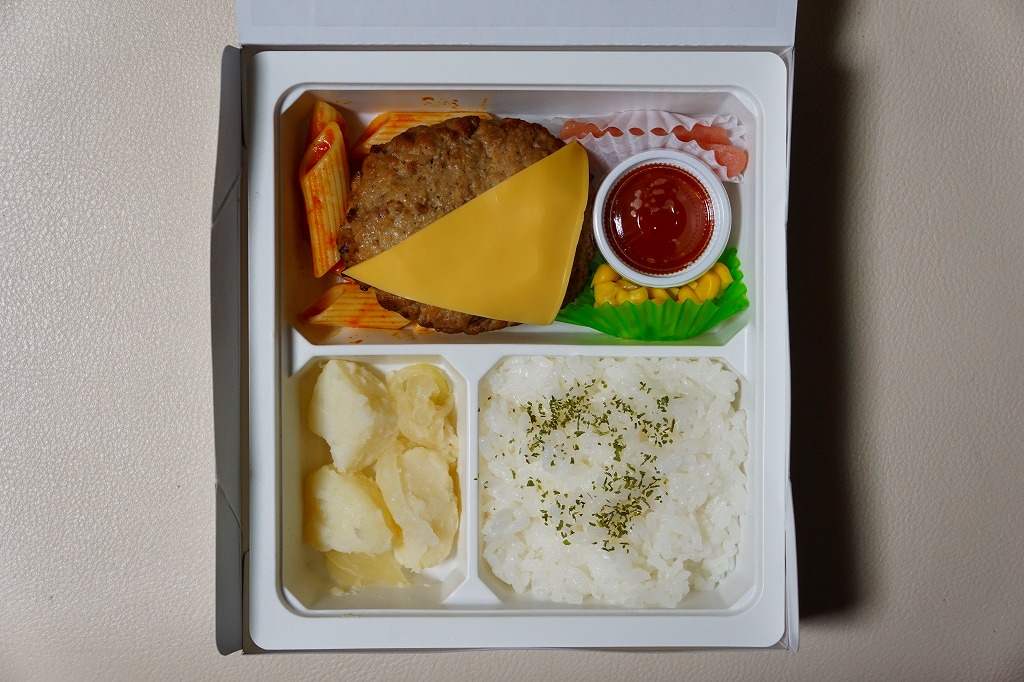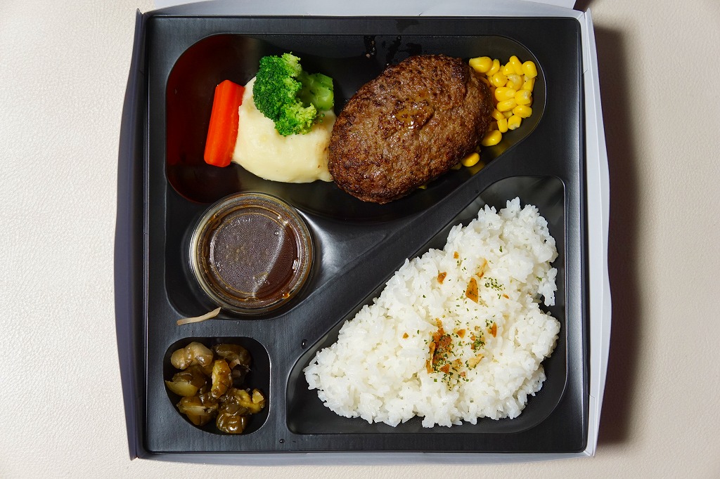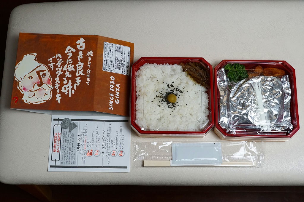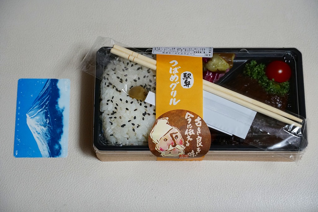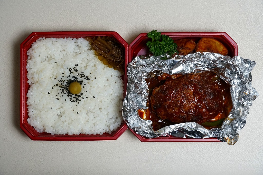他店舗では商品名を書いた樹脂テープで容器を留めるところを、この店舗では「駅弁」「つばめグリル」とアイコンを載せた黄色い紙帯で容器を留める。すべての商品で紙帯は共通で、これは看板商品の「ハンブルグステーキ弁当」。長方形のプラ容器に、日の丸御飯、ハンバーグデミグラスソース、ポテト、プチトマト、パセリ、牛ごぼう、ピクルスを詰める。中身や味が他店と変わることはない、個人的に大好きな味。食堂でハンブルグステーキを注文しても、だいたい同じ内容と風味になる。