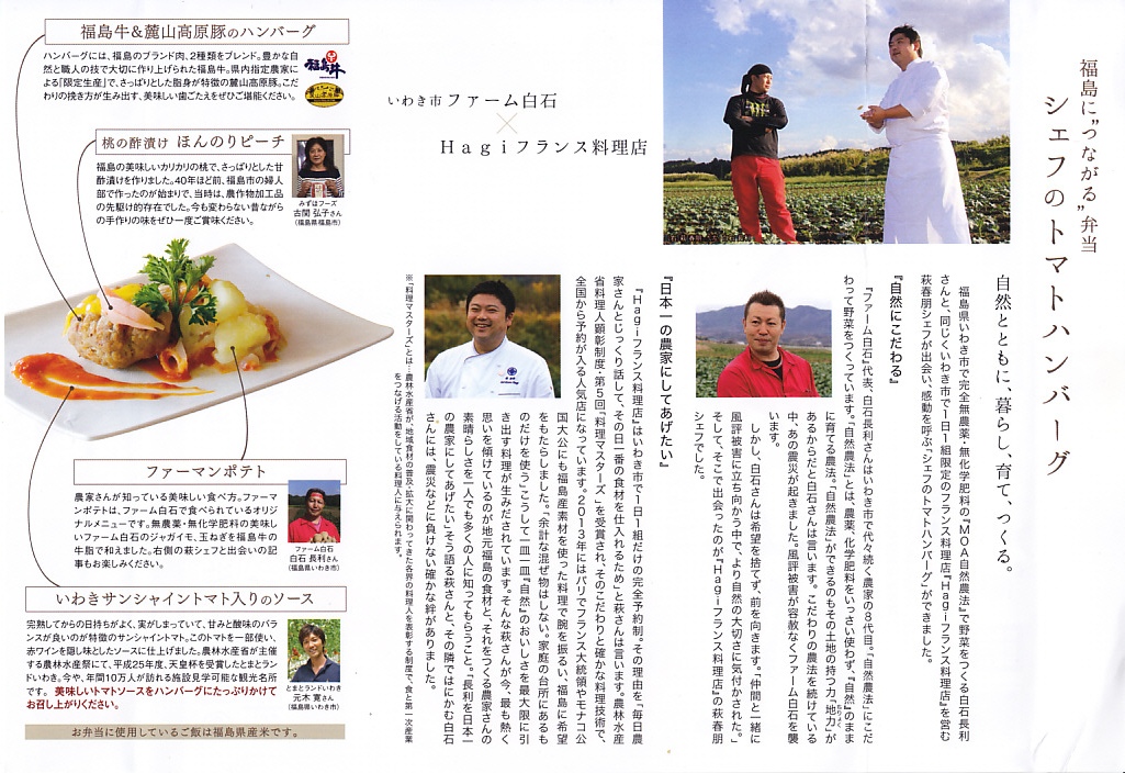 2015(平成27)年11月20日に東京駅の駅弁売店「駅弁屋 祭」で駅弁デビュー。福島県の農業プロデュース会社のコンセプトヴィレッジとIT大手のヤフーが共同開発し、NREと飲料大手のキリンの協力により販売した、福島がコンセプトのお弁当。コンセプトヴィレッジが、福島県産の食材を使い首都圏の企業向けに販売する弁当の第3弾にして、初めて一般に市販された弁当だという。調製は羽田の空弁屋である日本エアポートデリカが担当している。