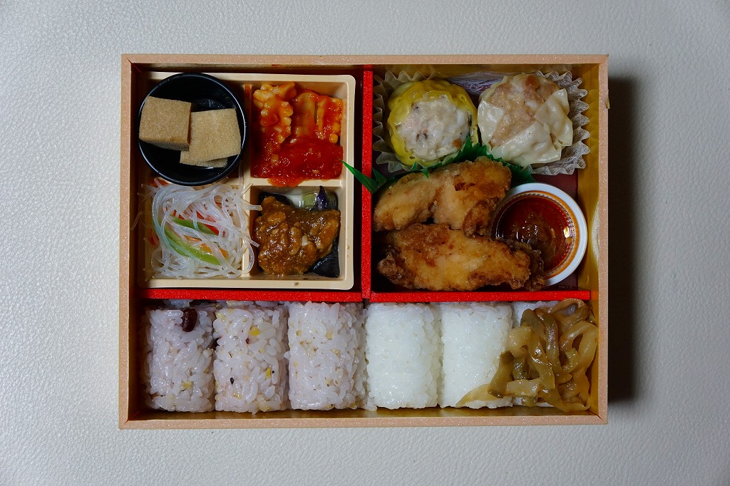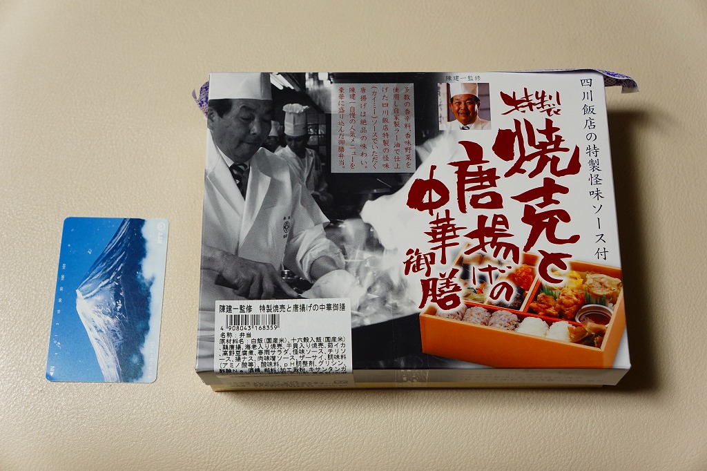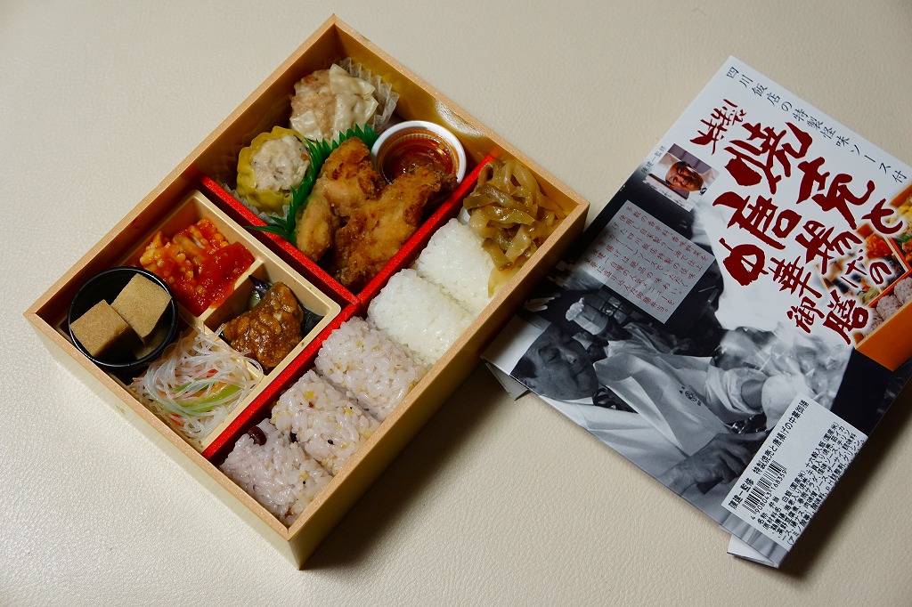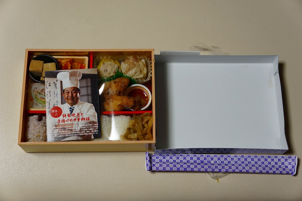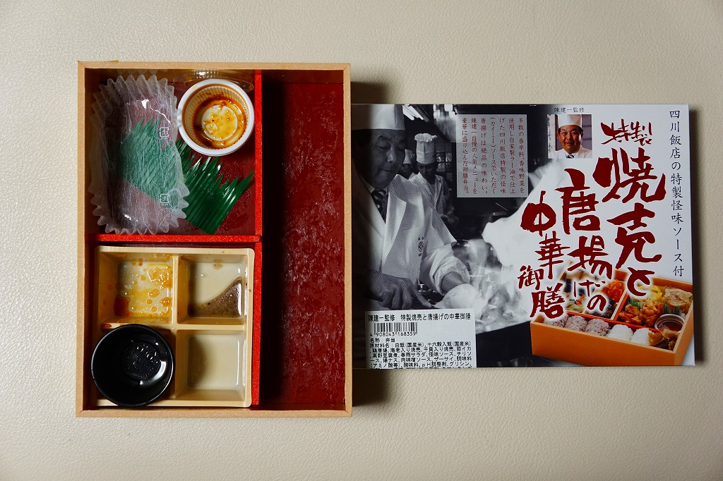 「陳建一監修」とのことで、パッケージにはその名前と写真が載り、中身の写真と商品名が描かれる。添付のしおりでもイラスト付きで描かれる中身は、十六穀米と白御飯の俵飯3個ずつに、焼売2種、鶏唐揚、ナス味噌炒め、イカチリ、春雨、高野豆腐など。四川料理を名乗るものの、ミニカップ入りの超激辛な「怪味ソース」を使わなければ、辛いものはないという親切な設計だった。2017年までの販売か。