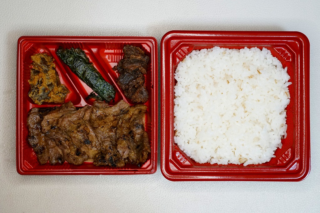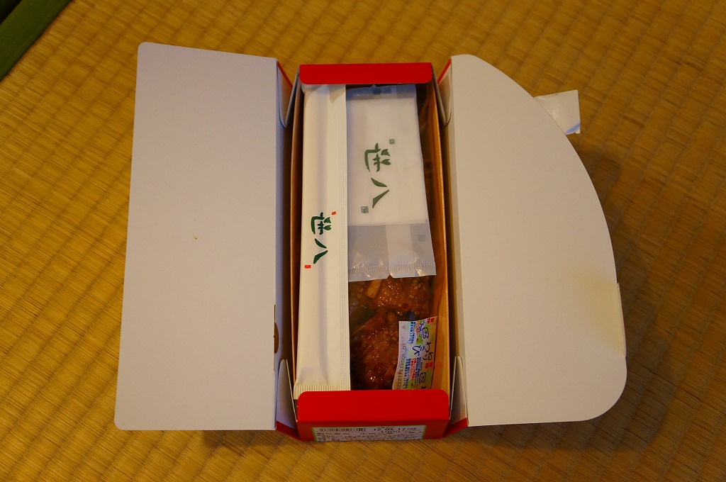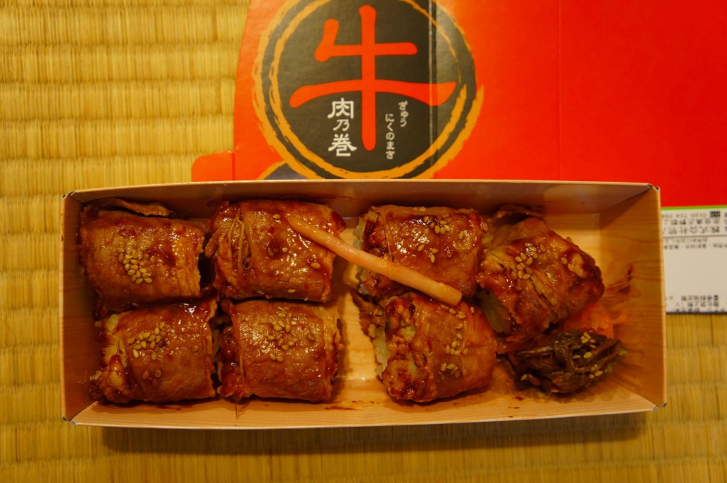 駅の中では2012(平成24)年に発売か。細長いボール紙の箱トレーを収めた、商品名と宣伝文と中身のイメージ写真を印刷した赤い紙箱に、スパイシーな味噌だれをたっぷり塗った牛肉で酢飯を巻く小さな俵飯が7個と、コマツナやダイコンなどのゴマ油和えが収まる。