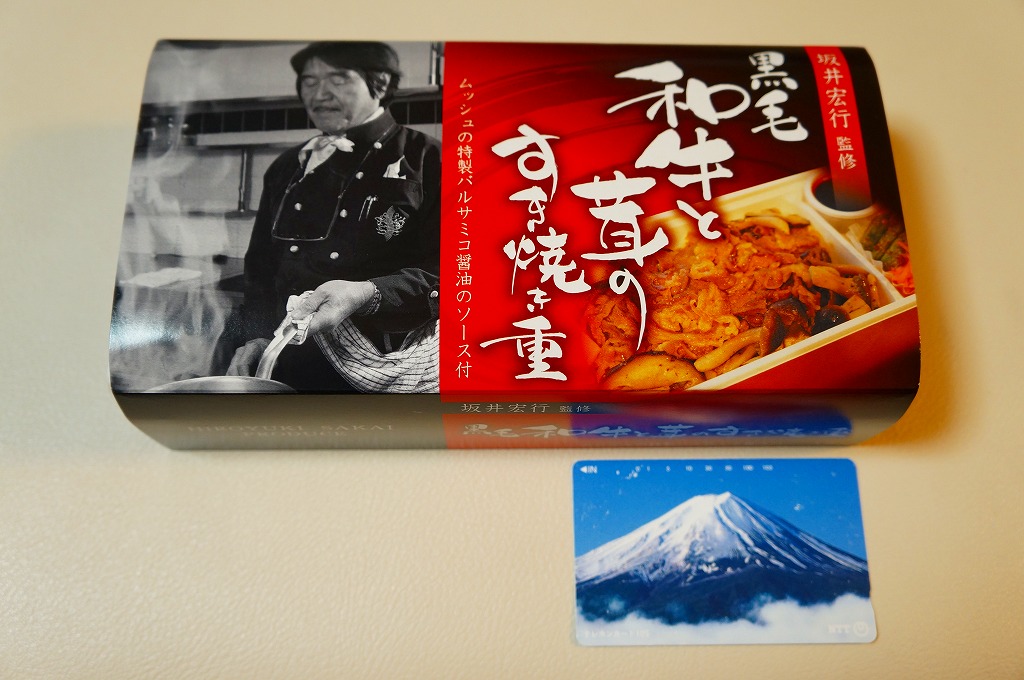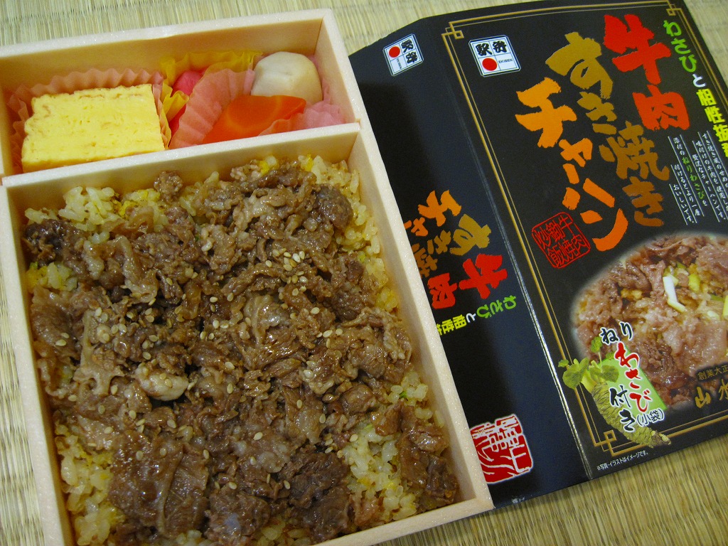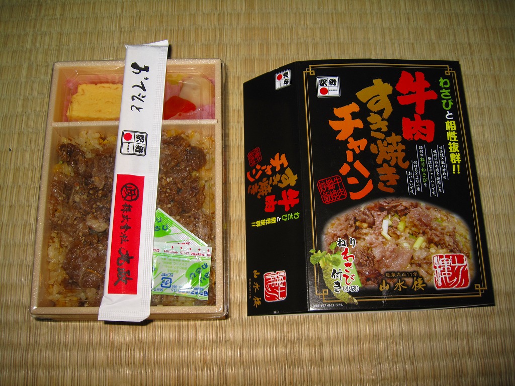 やや小柄な長方形の発泡材製容器に透明なふたをして、中身のイメージ写真や商品名や宣伝文を書いた黒いボール紙の枠にはめる。中身はチャーハンの上に牛すき焼き肉を詰めて、玉子焼、ニンジンとサトイモの煮物、赤かぶ漬を添えるもので、内容も風味も駅弁の名前どおり。ねりわさびが2袋も入り、これを使用することが推奨され、その個性的な仕掛けと味が特徴であるようだが、個人的にワサビは無理なので使わなかった。2014年までの販売か。